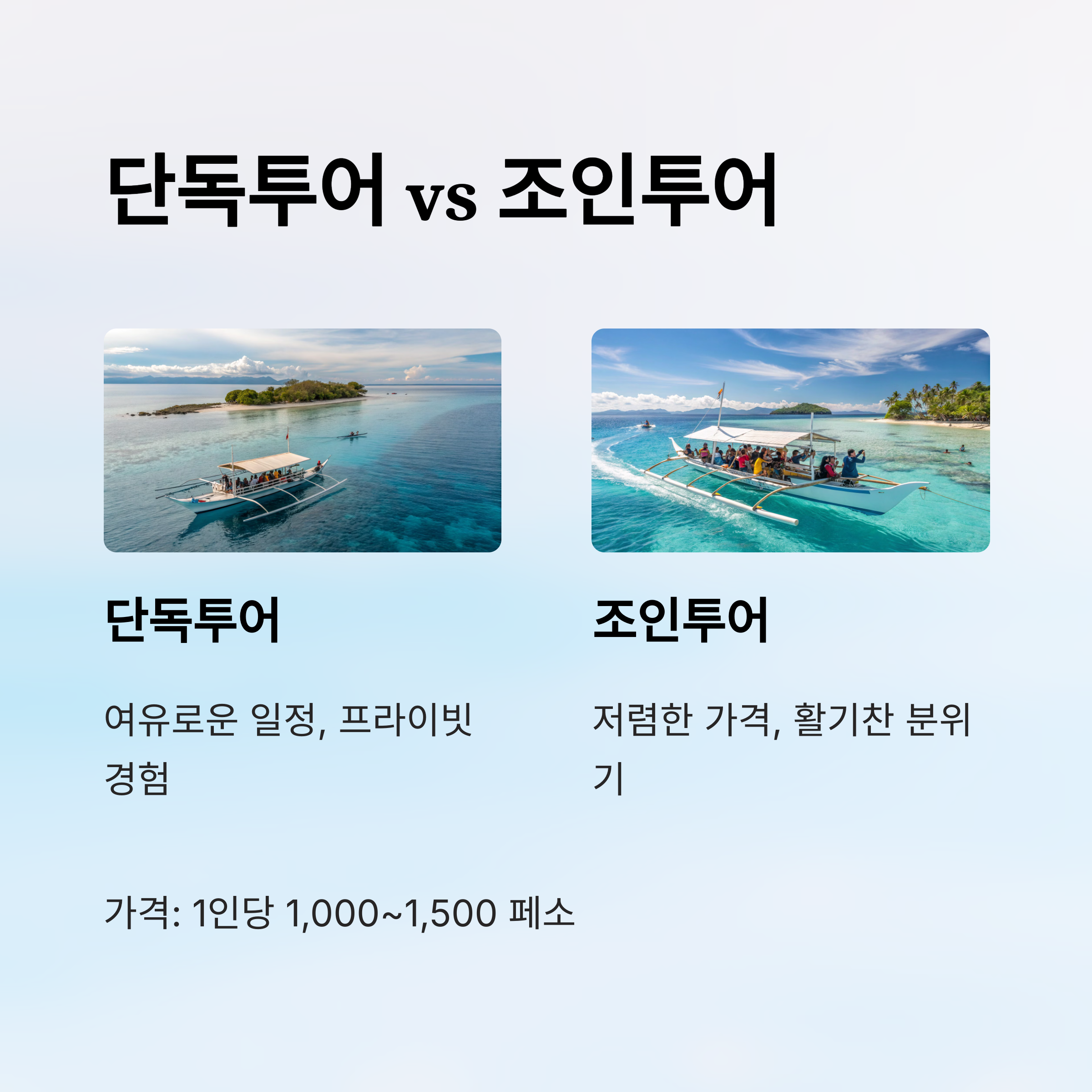 비용은 옵션에 따라 다르지만 일반적으로 1인당 1,000~1,500페소 선으로 매우 합리적인 편입니다. 단독 투어는 프라이빗하게 여유를 즐기기에 좋고, 조인 투어는 가격 메리트와 함께 다양한 사람들과의 만남이 큰 장점입니다. 또한 방수 카메라, 여벌 옷, 자외선 차단제 등을 미리 준비하면 더 완벽한 일정을 보낼 수 있습니다.