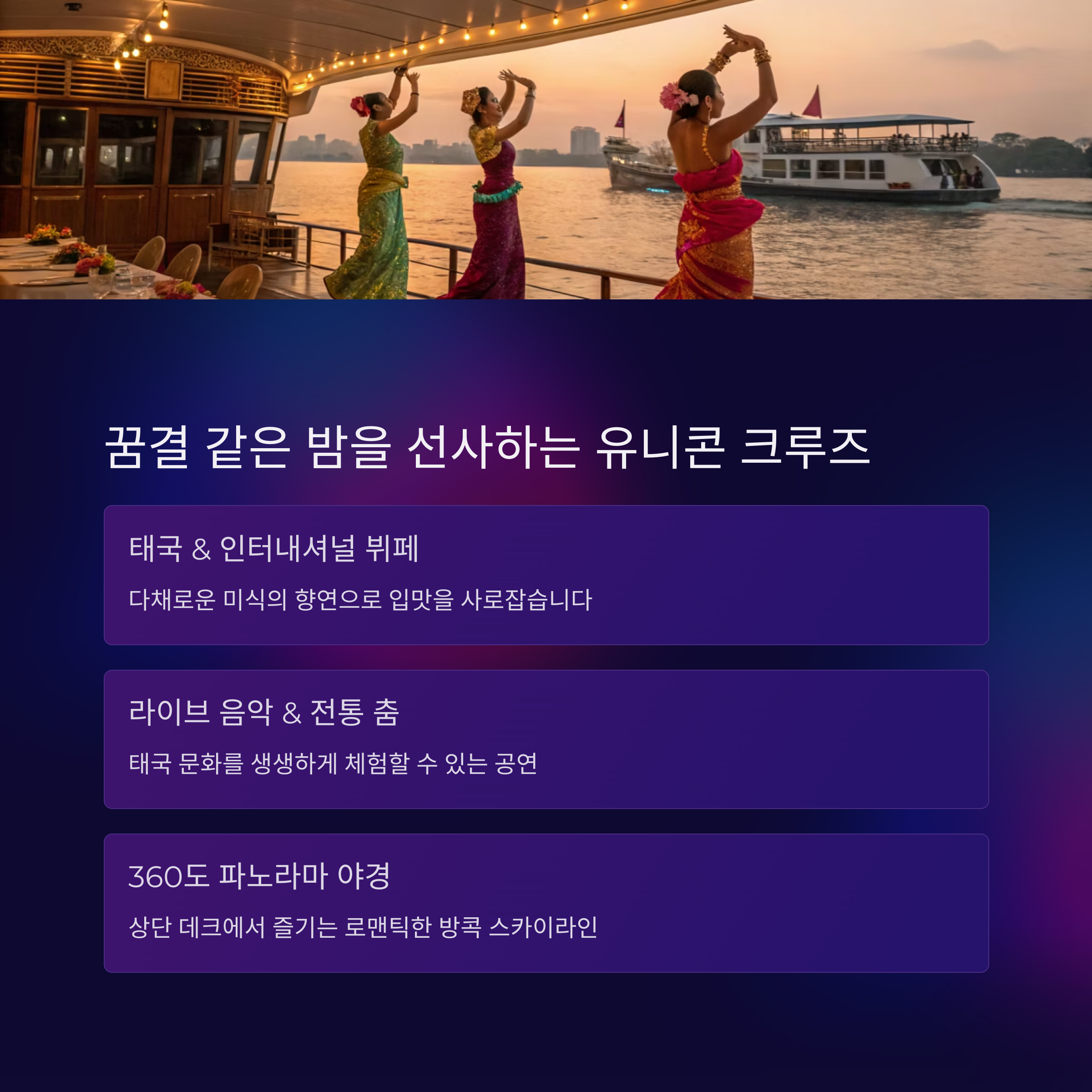 Unicorn 디너크루즈 전통 공연과 태국/인터내셔널 뷔페가 포함돼요.