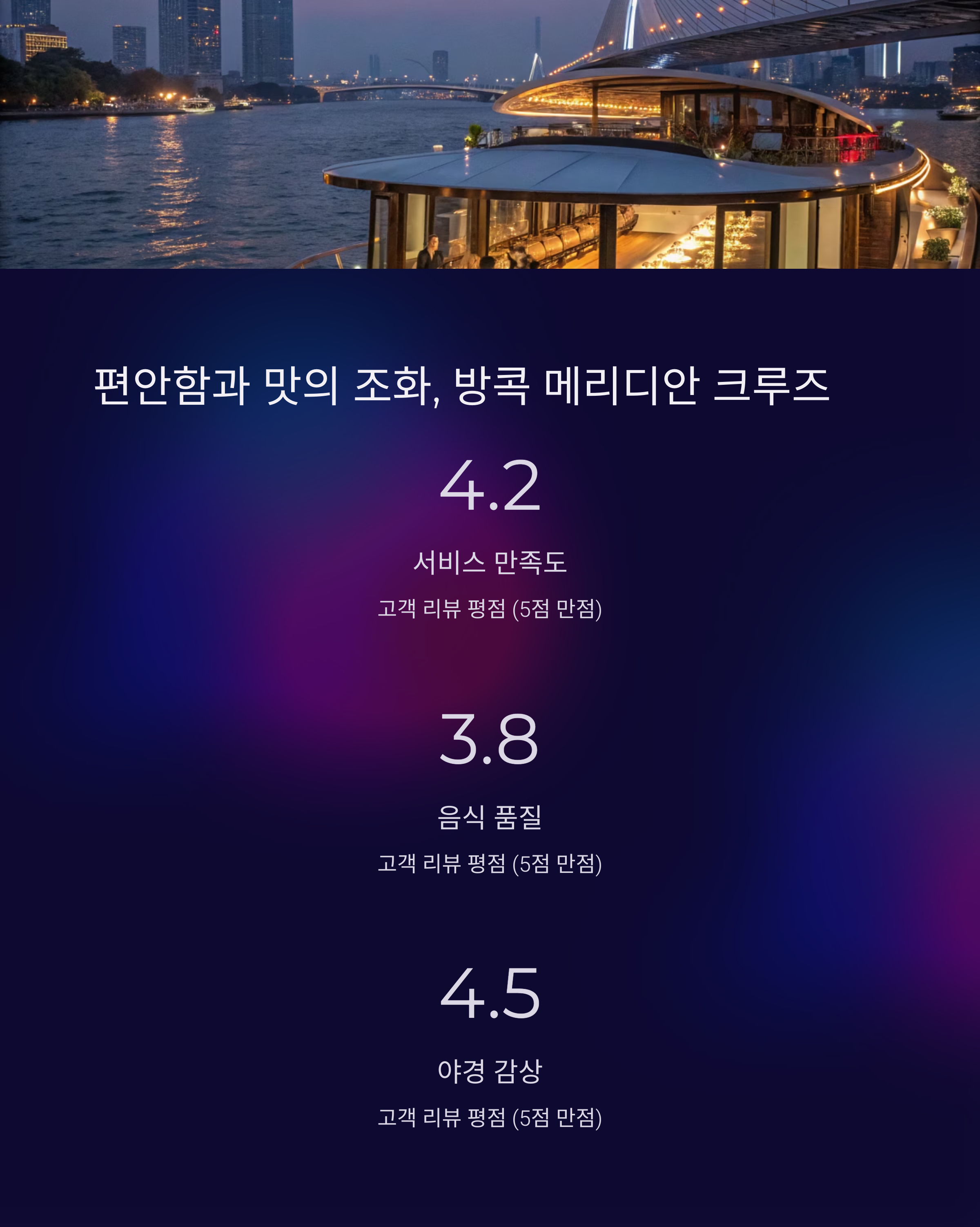 Bangkok Meridian 크루즈는 편안한 좌석 배치와 세련된 실내 인테리어, 그리고 친절한 서비스가 돋보이지만, 일부 투숙객은 체크인 시 혼잡함을 경험했다고 합니다. 뷔페는 종류는 다양했지만 간혹 음식의 온도나 맛이 아쉽다는 후기도 있어 기대치를 잘 조율하면 보다 만족스러운 선택이 될 수 있습니다.