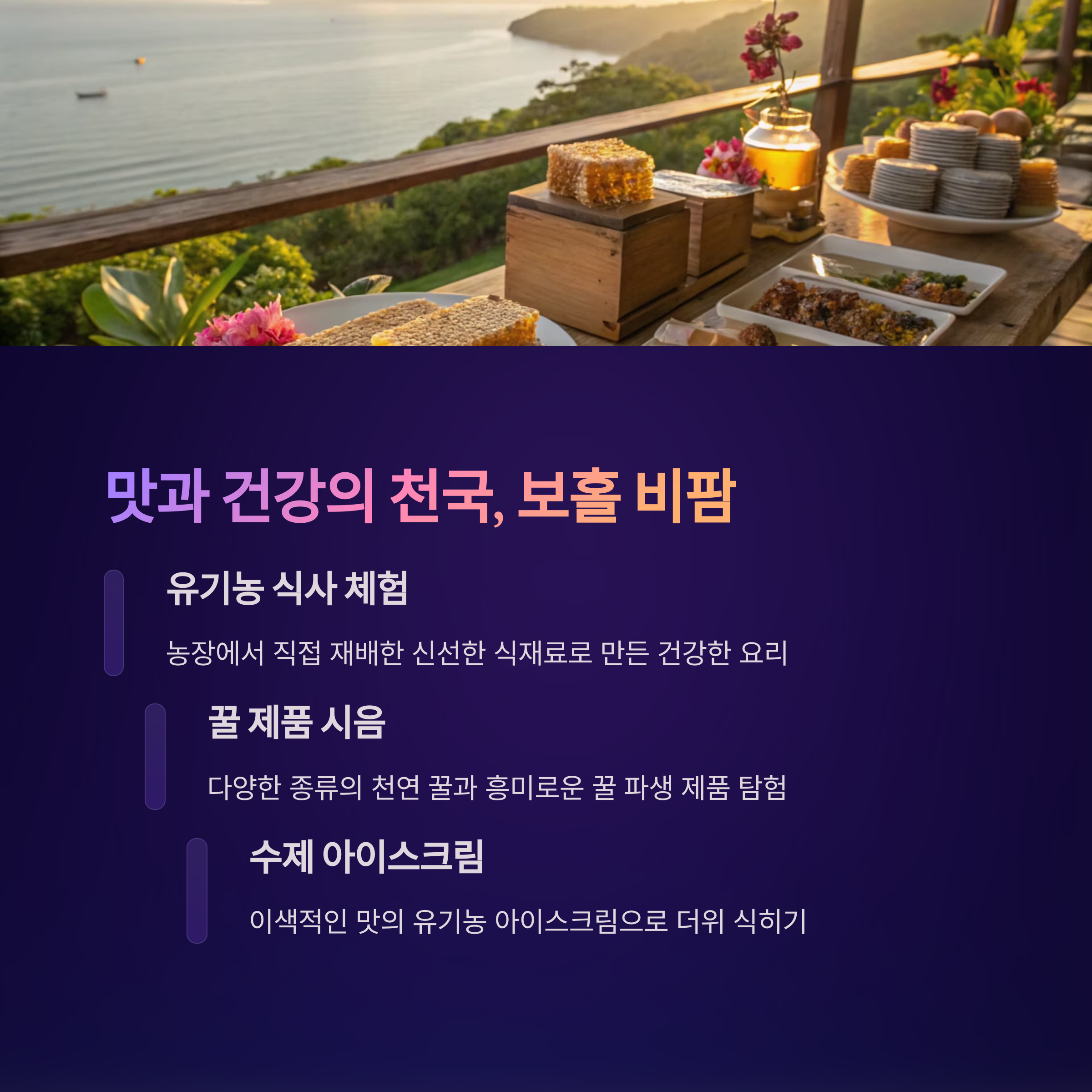 보홀 육상 투어는 섬의 다양한 명소를 하루에 효율적으로 둘러볼 수 있어 첫 방문자에게 특히 유용한 코스입니다. 히낙다난 동굴은 신비로운 동굴 속 석회암 지형과 맑은 물로 유명하며, 비 농장에서는 유기농 허브와 식물들을 체험할 수 있습니다. 다우이스 교회는 아름다운 고딕 양식으로 사진 명소로도 잘 알려져 있어요.