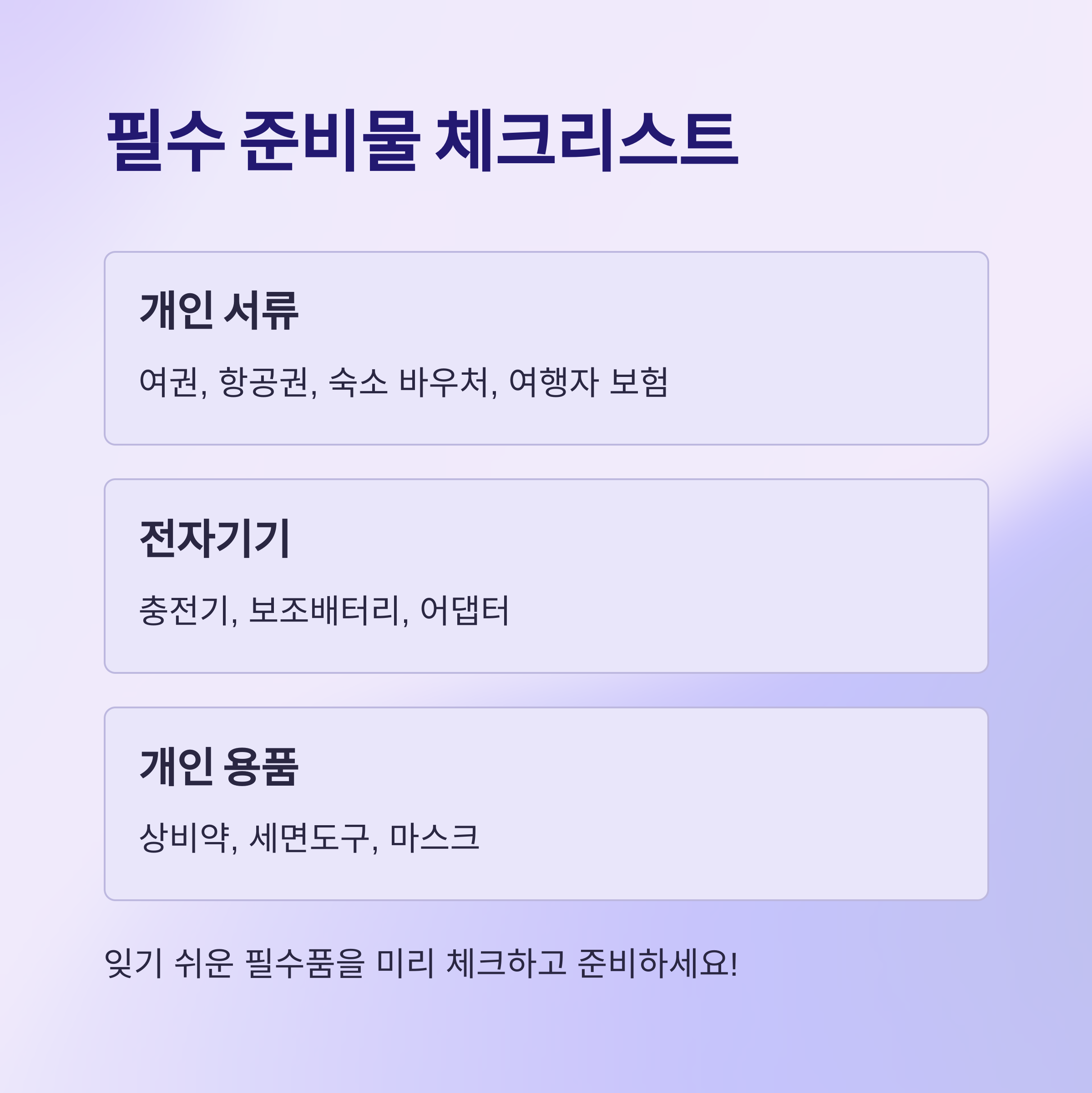 | 체크박스로 항목 하나씩 확인 | 신발 속에 양말, 약통에 액세서리 | 비상 상황 대비로 꼭 준비 |