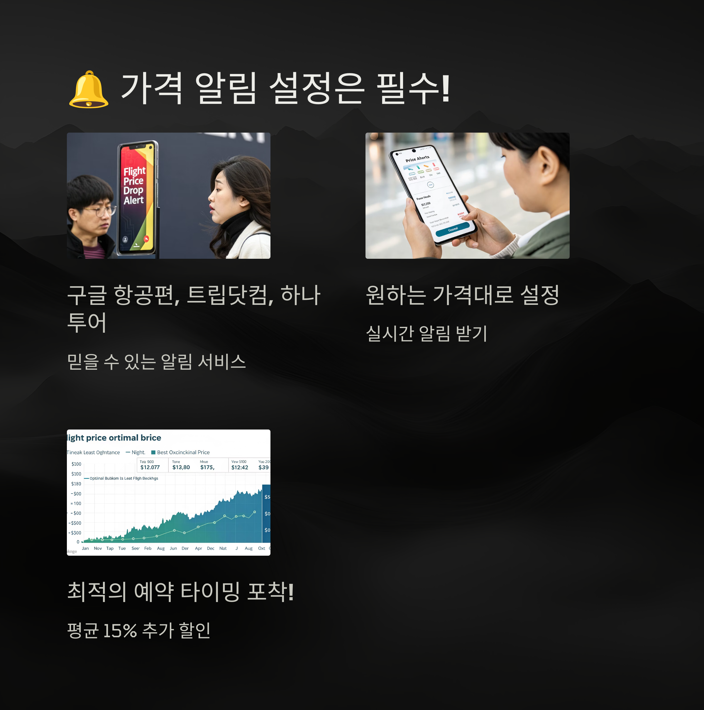 가격 알림 설정은 예약 타이밍을 놓치지 않기 위한 최고의 도구입니다. 구글 플라이트에서는 원하는 경로를 검색한 뒤 [가격 추적] 버튼을 누르면 이메일로 알림을 받을 수 있고, 트립닷컴과 하나투어 앱에서도 알림 기능이 제공되어 매우 편리해요. 알림 설정만 해두면 매일 검색하지 않아도 되기 때문에 시간도 아끼고 가격도 아낄 수 있습니다.