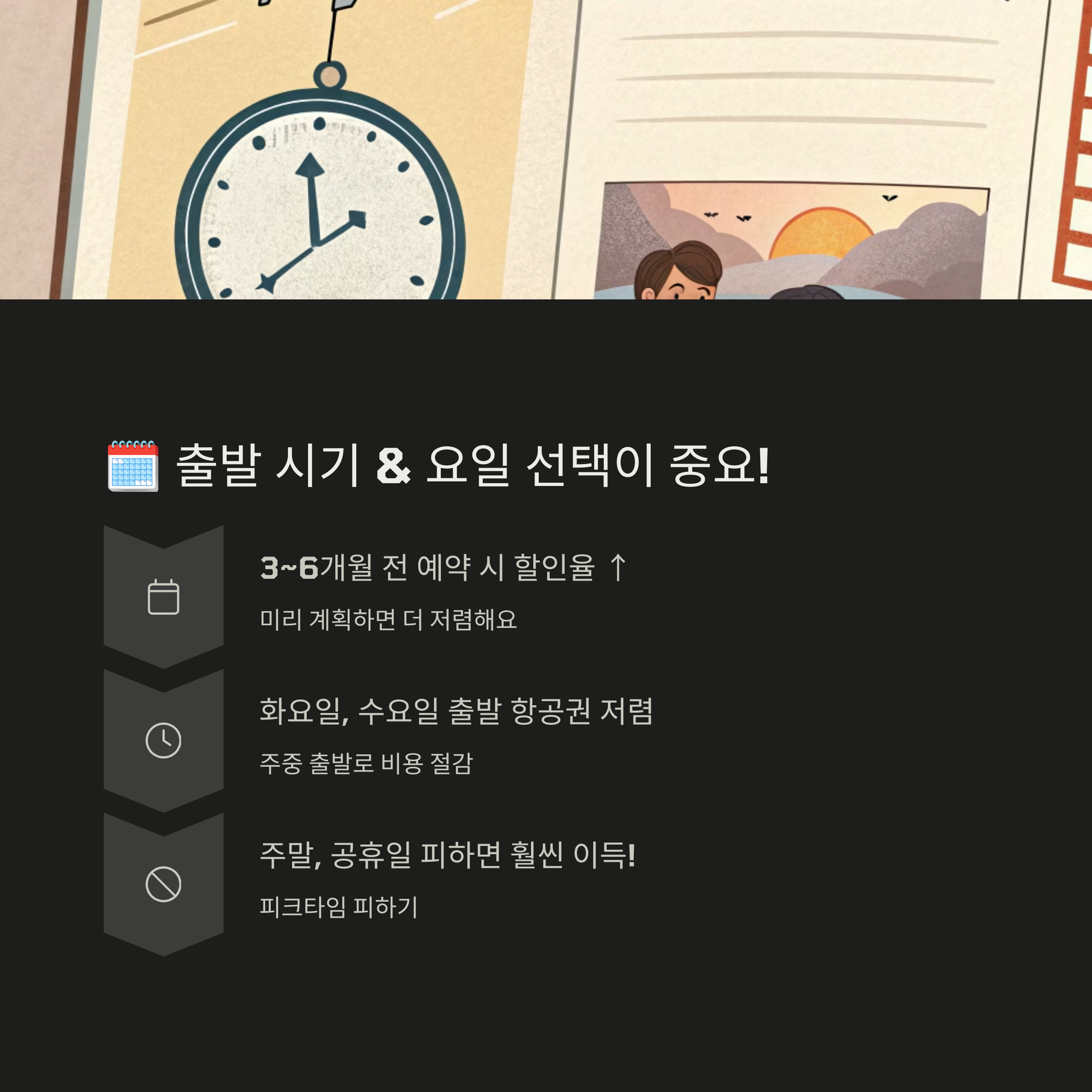 항공권은 출발 요일, 성수기·비수기, 예약 시점에 따라 가격 차이가 큽니다. 일반적으로 화요일, 수요일 출발, 비수기 여행, 출발 3~6개월 전 예약이 가장 유리하며, 갑작스러운 특가 이벤트를 실시간으로 캐치할 수 있는 알림 기능은 필수입니다.