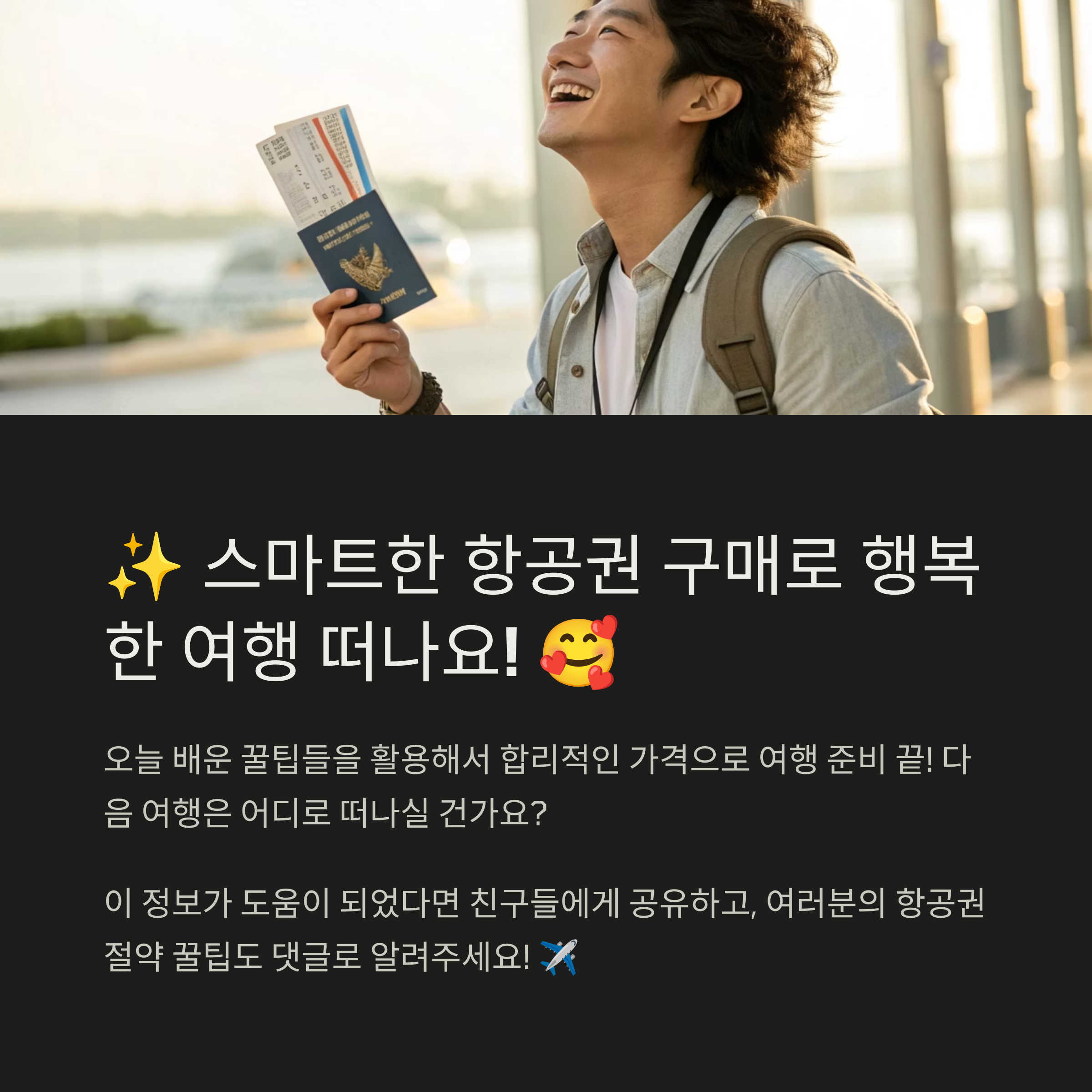항공권을 저렴하게 구매하는 방법은 의외로 간단합니다. 비교 사이트 확인 + 가격 알림 설정 이 두 가지를 실천하는 것만으로도 수십만 원을 절약할 수 있어요. 앞으로는 무작정 검색하지 말고 전략적으로 항공권을 구매해보세요. 알림 하나로 여행 예산이 달라집니다!