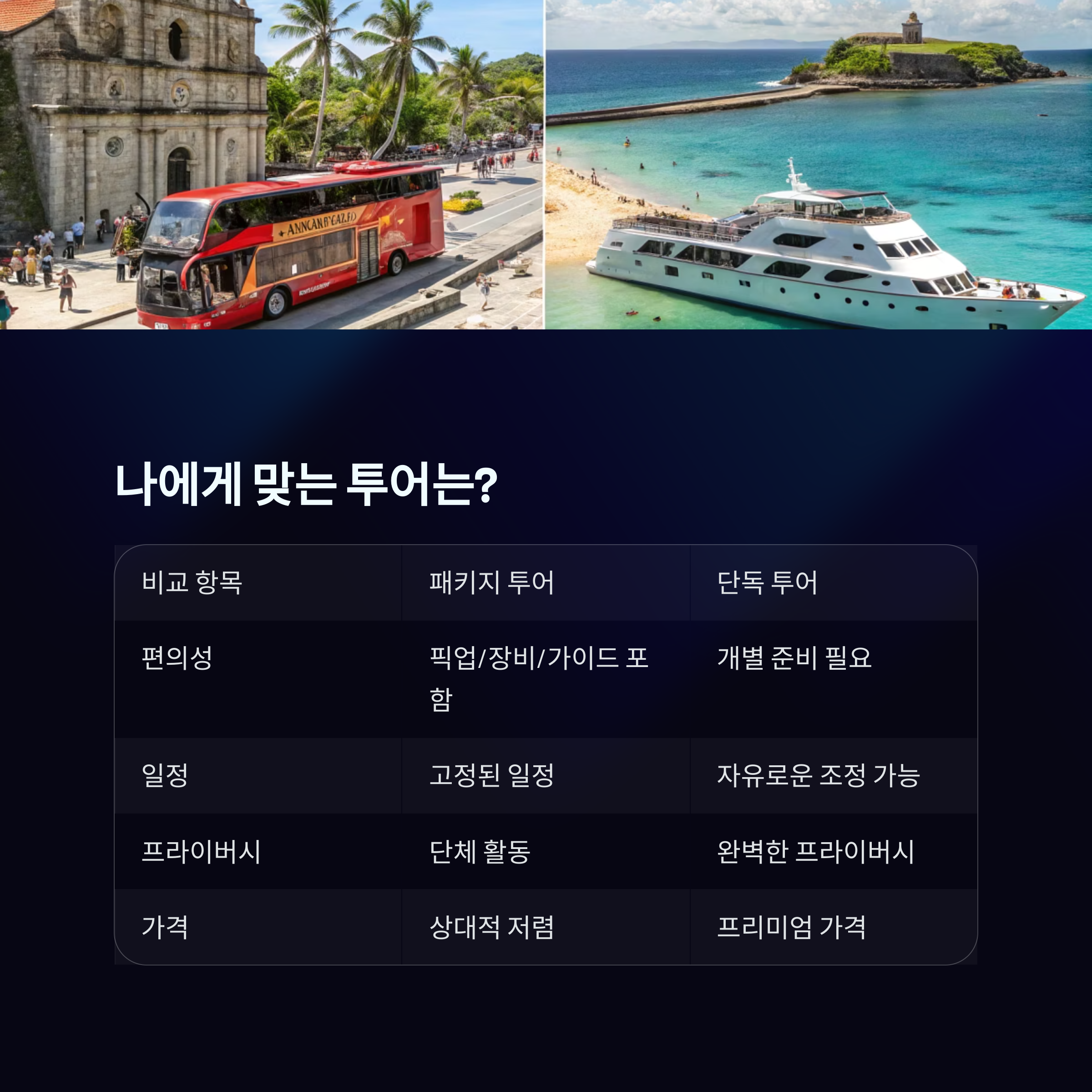 여행을 계획할 때, 자유여행과 패키지여행 중 어느 쪽을 선택할지 고민하는 분들이 많습니다. 특히 세부처럼 즐길 거리와 이동 요소가 많은 여행지에서는 선택에 따라 여행의 전체적인 만족도가 달라지기도 합니다. 가족과 함께라면 일정이 유연하고 프라이빗한 구성이 더 매력적으로 느껴질 수 있으며, 첫 해외여행이거나 편안함을 중시한다면 숙련된 가이드와 체계적인 일정이 포함된 패키지여행이 큰 도움이 될 수 있습니다.