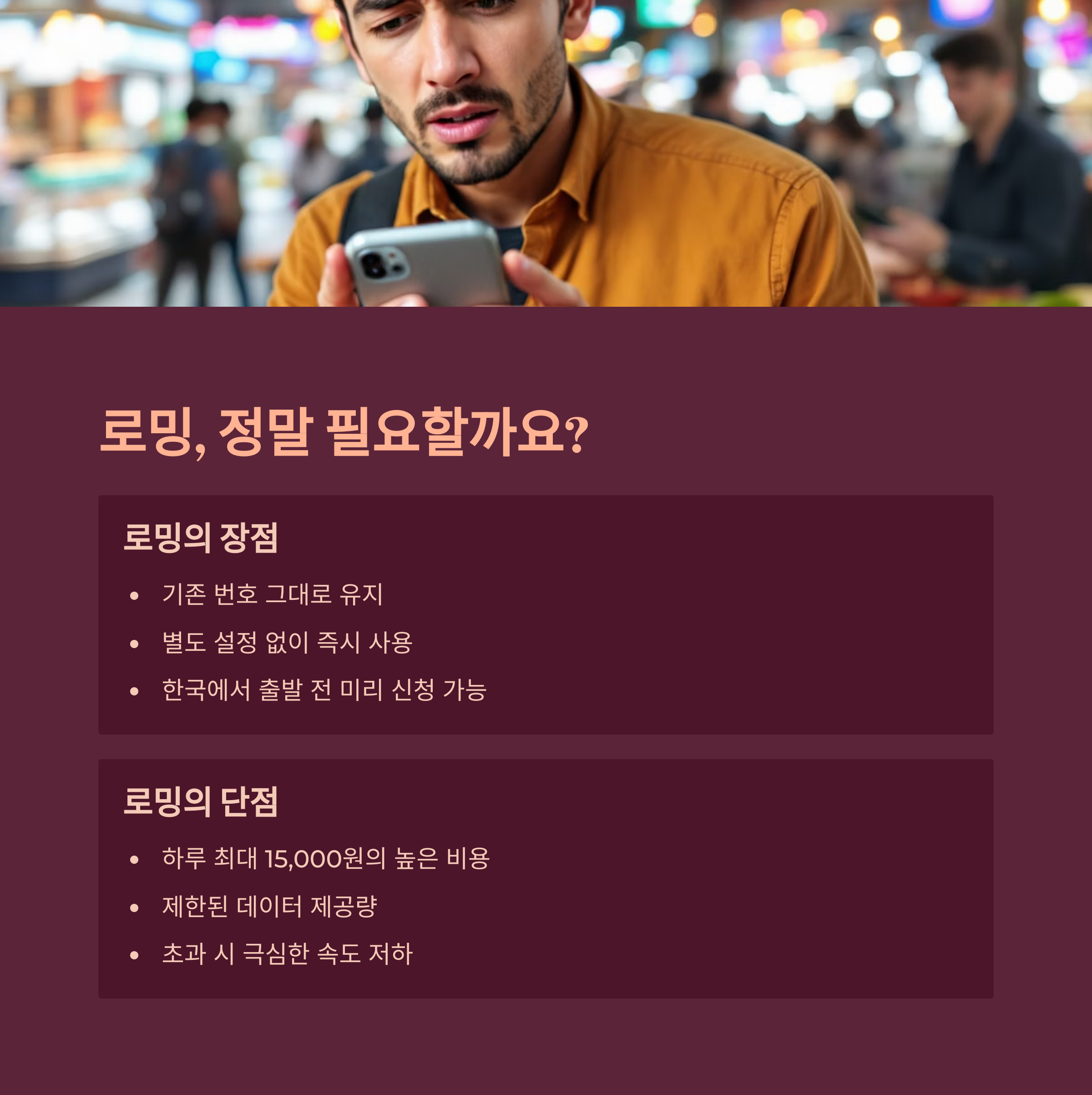로밍 요금 데이터 제한과 높은 비용이 단점으로 지적됩니다