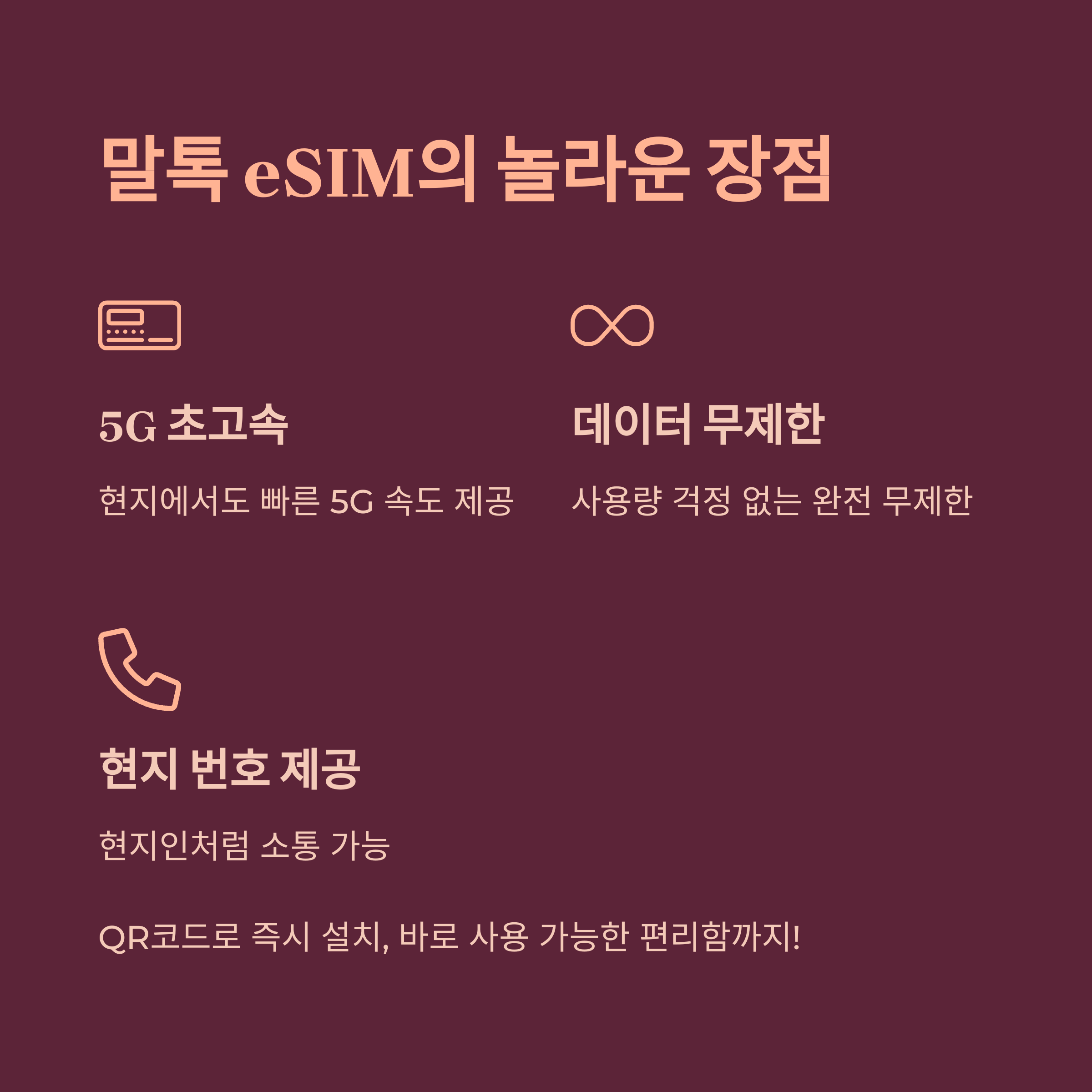 현지 번호 제공, 설치 간편, 속도 빠름 번호 유지 가능, 데이터 초과 시 속도 저하 공항 도착 전에 설치하면 바로 사용 가능
