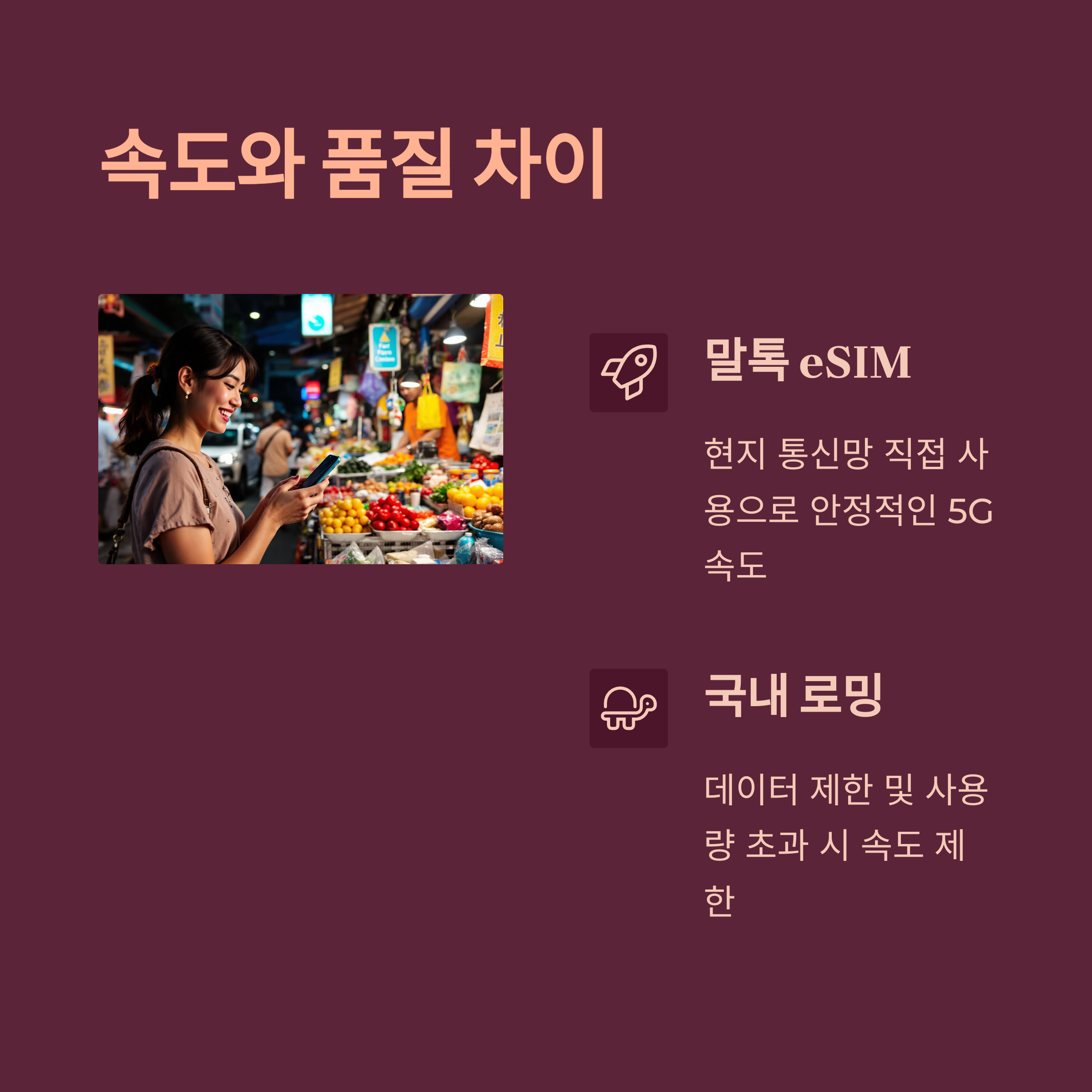 eSIM은 현지 통신망을 직접 이용하므로, 로밍보다 더 빠르고 안정적인 속도를 제공하는 경우가 많습니다. 특히 도심에서는 차이가 큽니다.