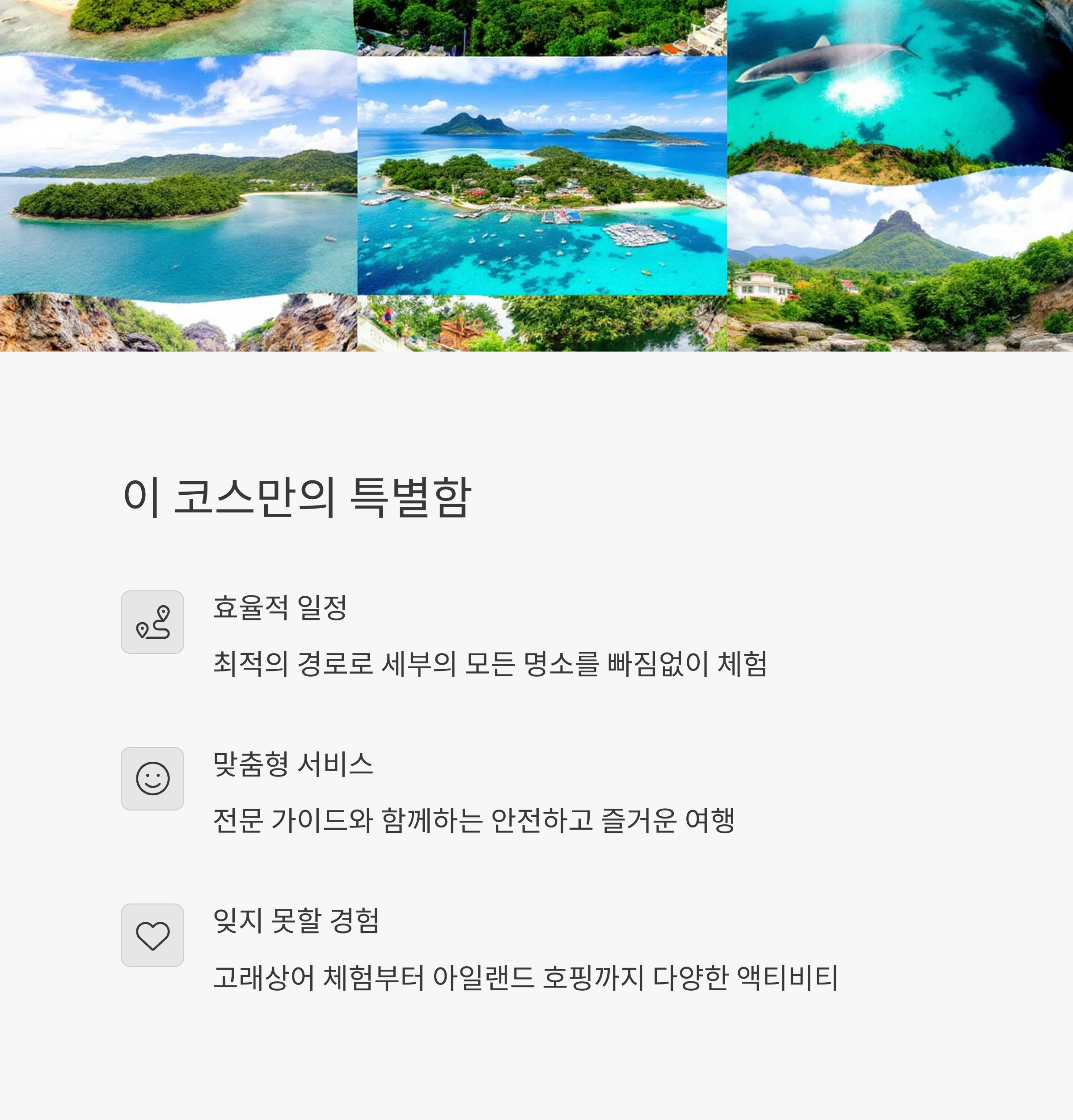 셋째 날에는 오슬롭 고래상어 투어, 수밀론 샌드바, 투말록 폭포, 카와산 폭포나 캐녀닝 체험이 이어지며, 넷째 날은 막탄에서 호핑 투어로 바다를 만끽하게 됩니다. 마지막 날은 호텔 체크아웃 후 공항 샌딩 차량으로 편하게 이동하면서 여정을 마무리하게 됩니다. 이 일정은 바쁜 도시생활 속 짧은 휴가에도 알차게 세부를 경험할 수 있도록 설계되어 있어 만족도가 매우 높습니다.