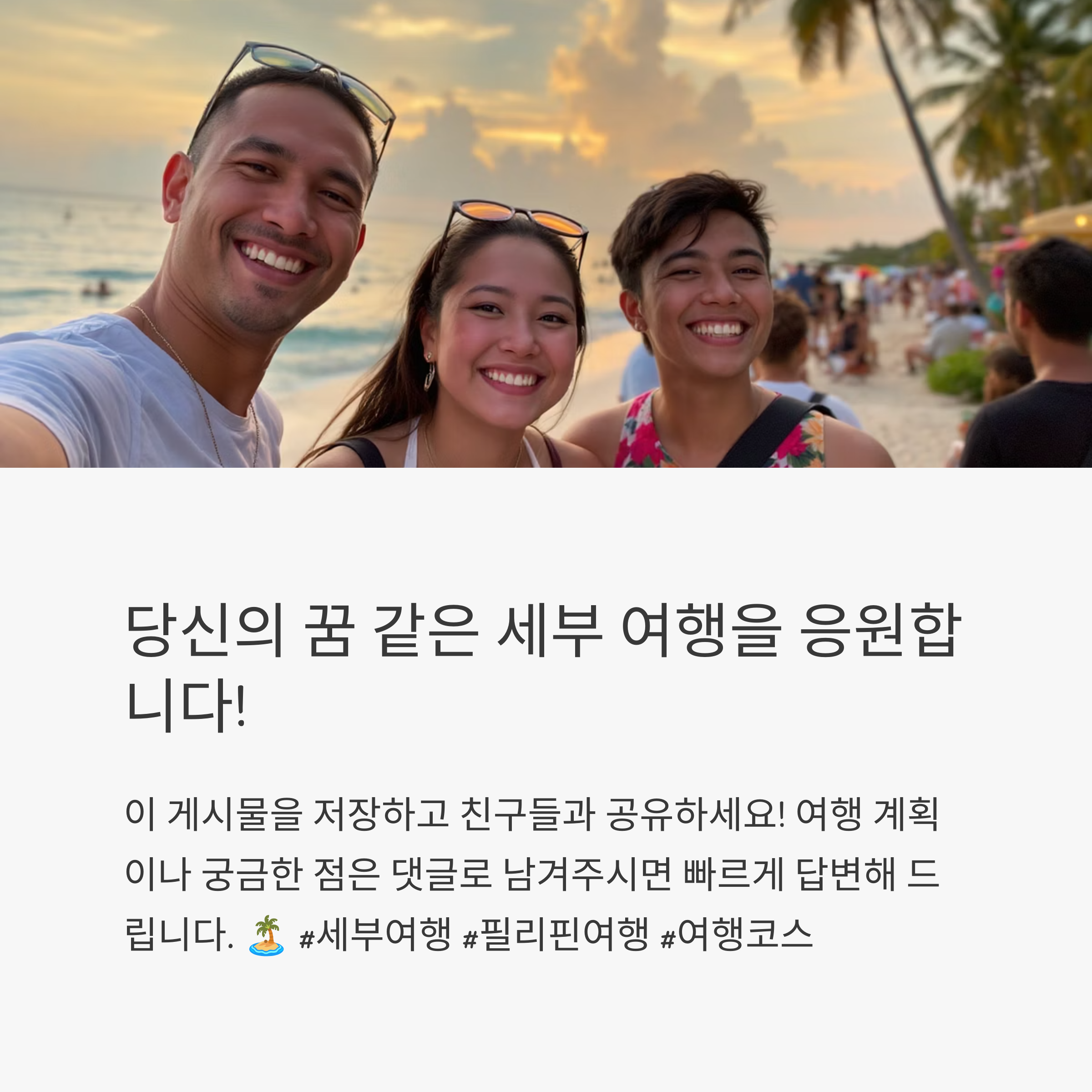세부 여행 중 가장 기억에 남는 장소는 어디였나요? 또는 3박 5일 일정 중 추가되었으면 하는 장소가 있다면 댓글로 공유해주세요! 여러분의 여행 팁이 다른 분들의 일정 구성에 큰 도움이 됩니다.