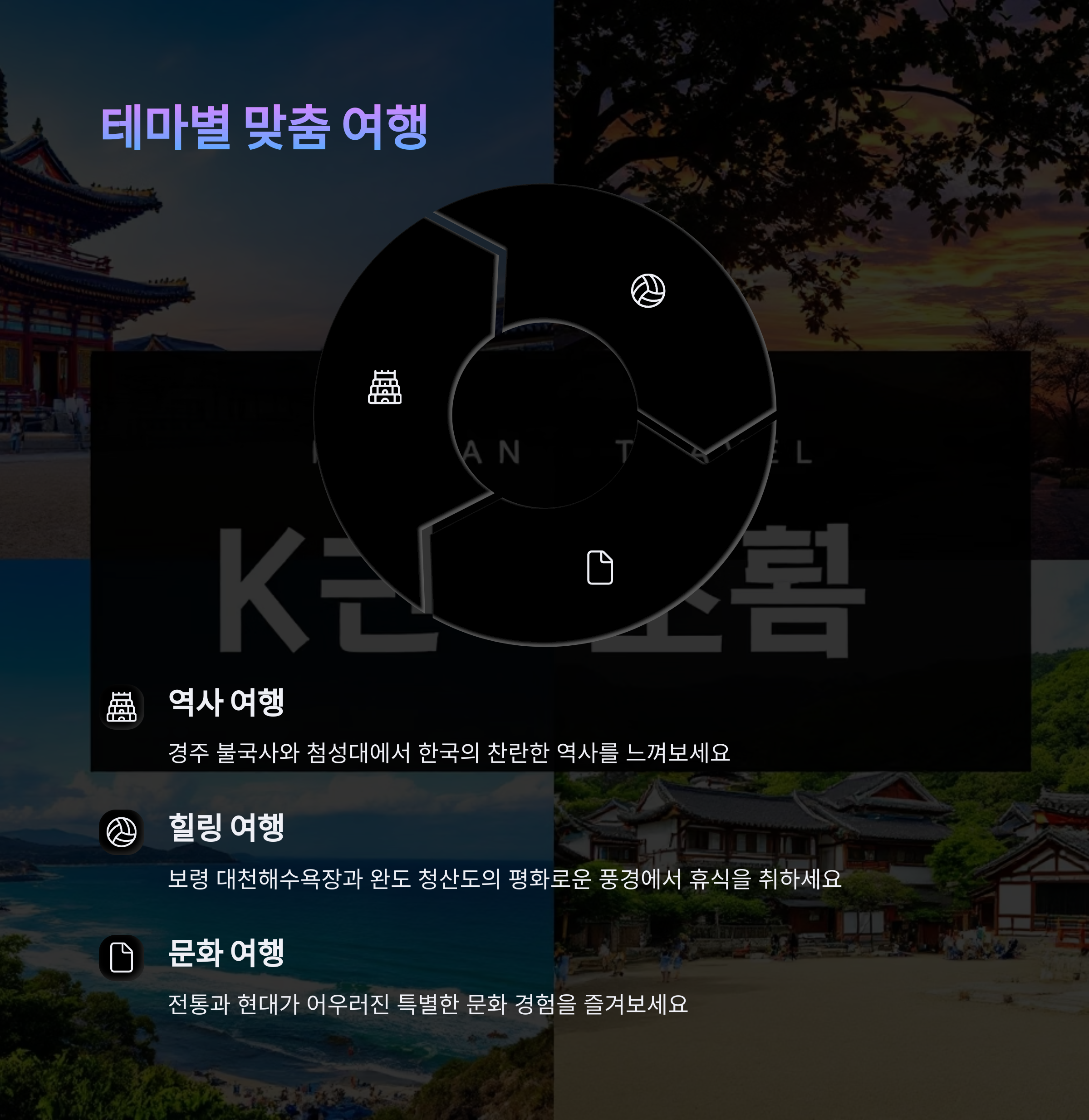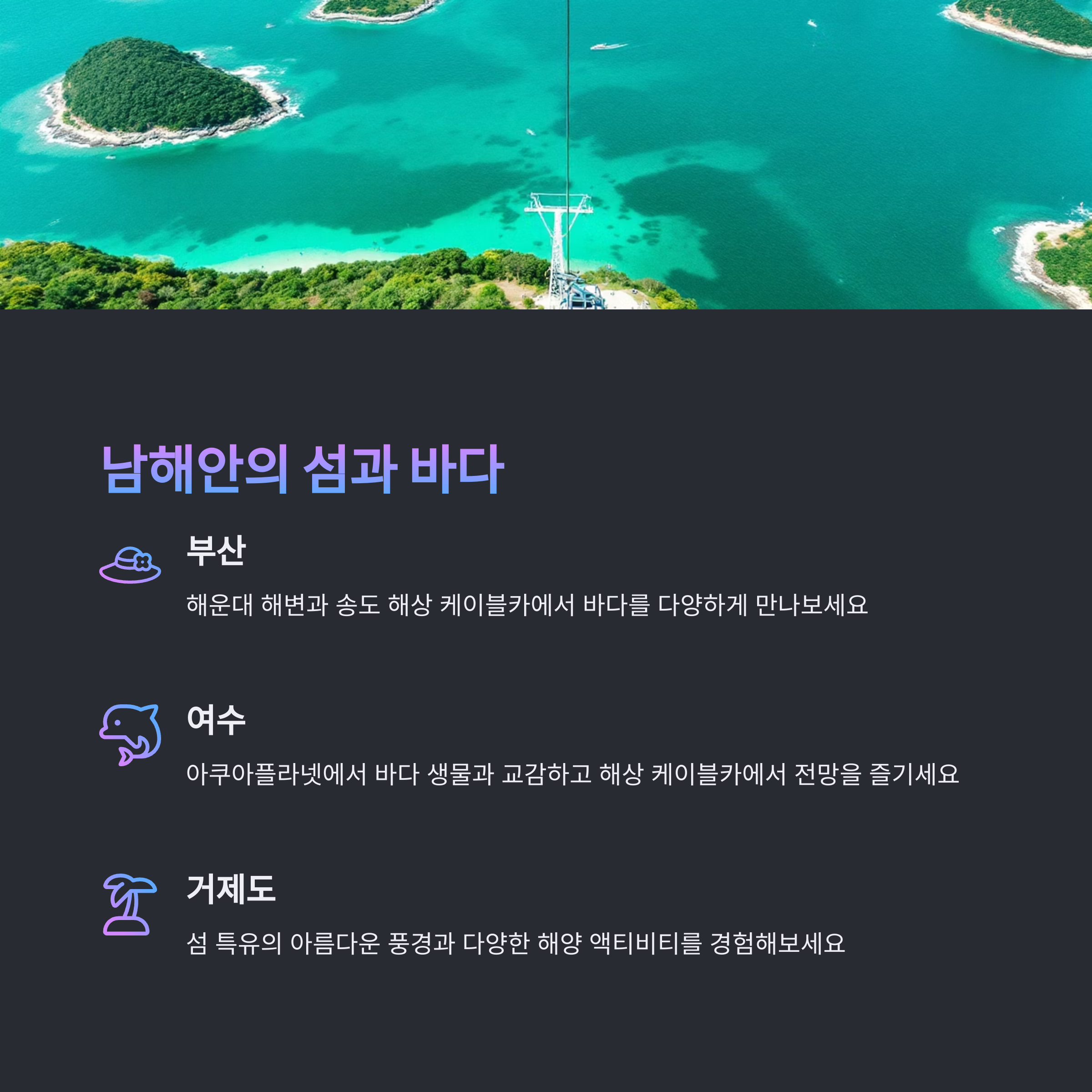 | 남해/내륙 명소 | 거제, 여수, 담양, 경주 등 풍경과 체험 모두 가능 |