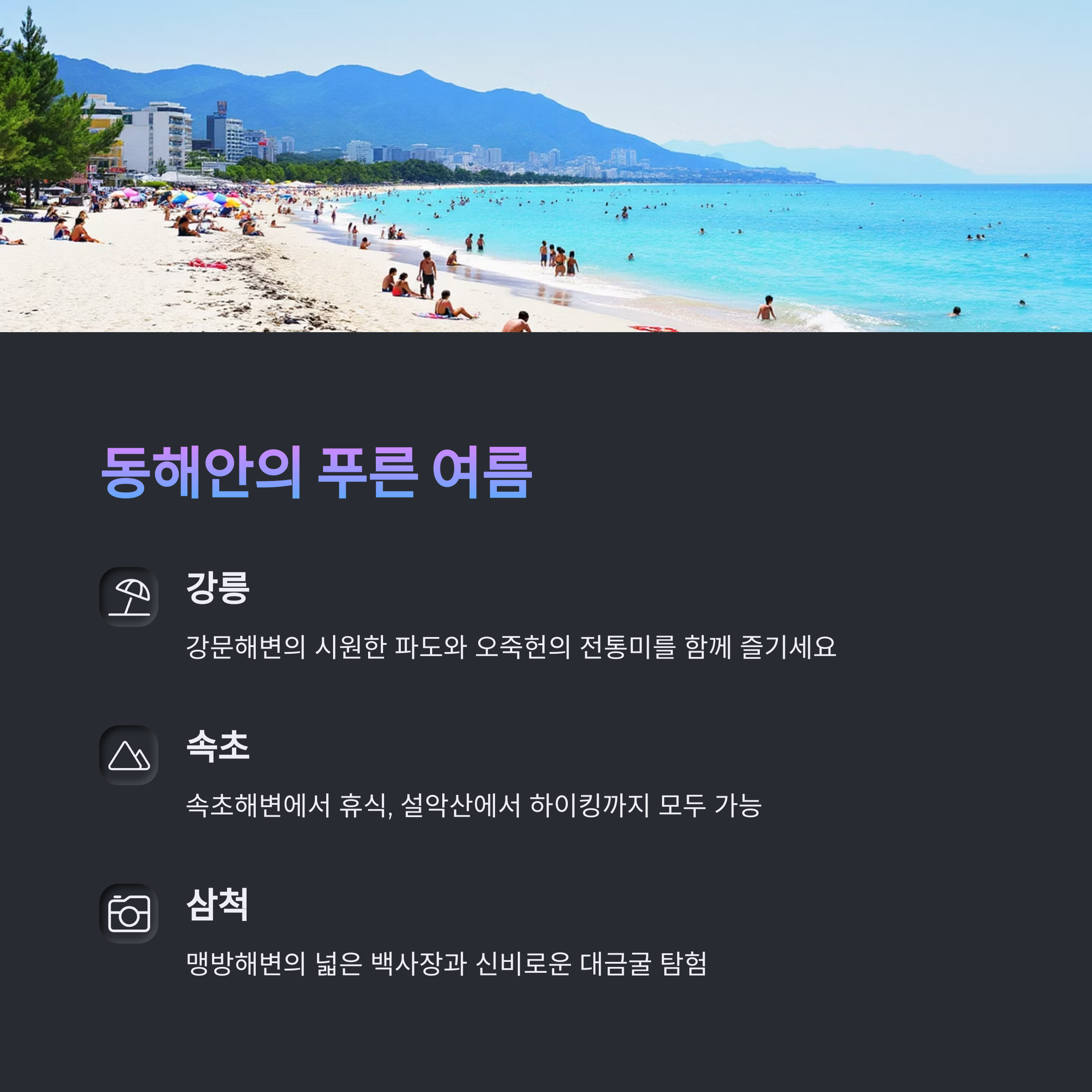| 동해안 추천지 | 강릉, 속초, 삼척 등 시원한 바다와 계곡 풍경 |
