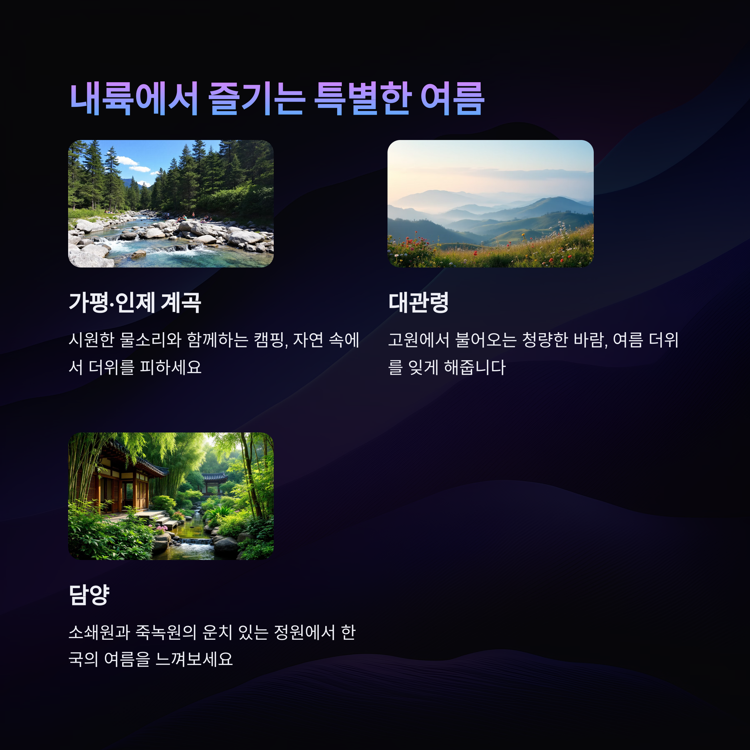 | 계곡, 해수욕장, 섬 여행 등 풍성한 선택지 | 강릉, 속초, 여수, 거제, 제주까지 | 자연 속 휴식과 문화 체험을 모두 경험 |