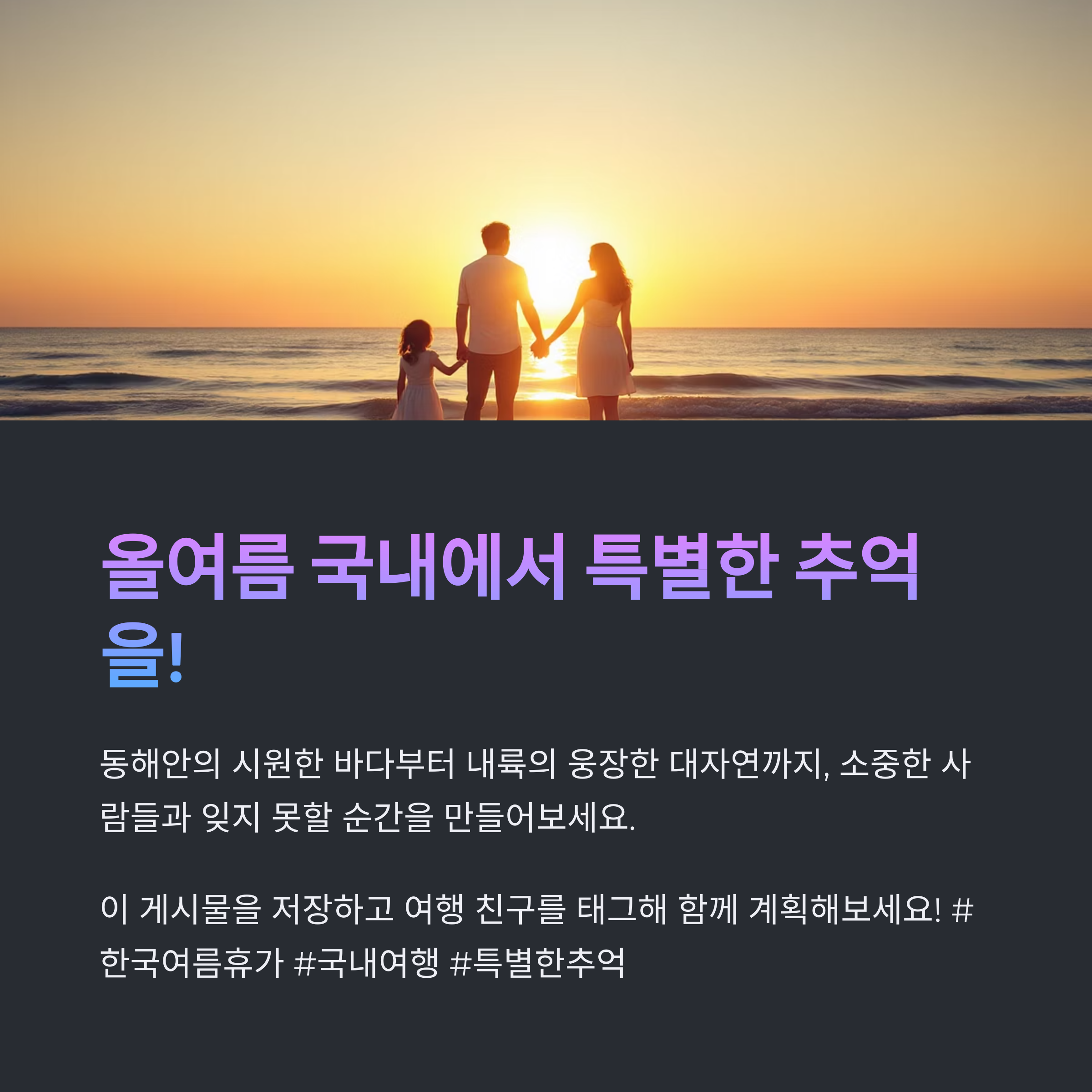 여름휴가를 준비하는 여러분에게 국내 여행은 다시 주목받는 선택지입니다. 해변과 계곡, 섬과 도시, 자연과 문화가 어우러진 다양한 지역이 있어 누구와 함께여도 만족스러운 여행을 떠날 수 있습니다. 해외 못지않은 풍경과 체험, 그리고 접근성까지 갖춘 대한민국 곳곳의 명소를 따라가다 보면, 올여름도 충분히 특별한 기억을 만들 수 있을 것입니다. 지금 당장 여행지 리스트를 작성해보세요!