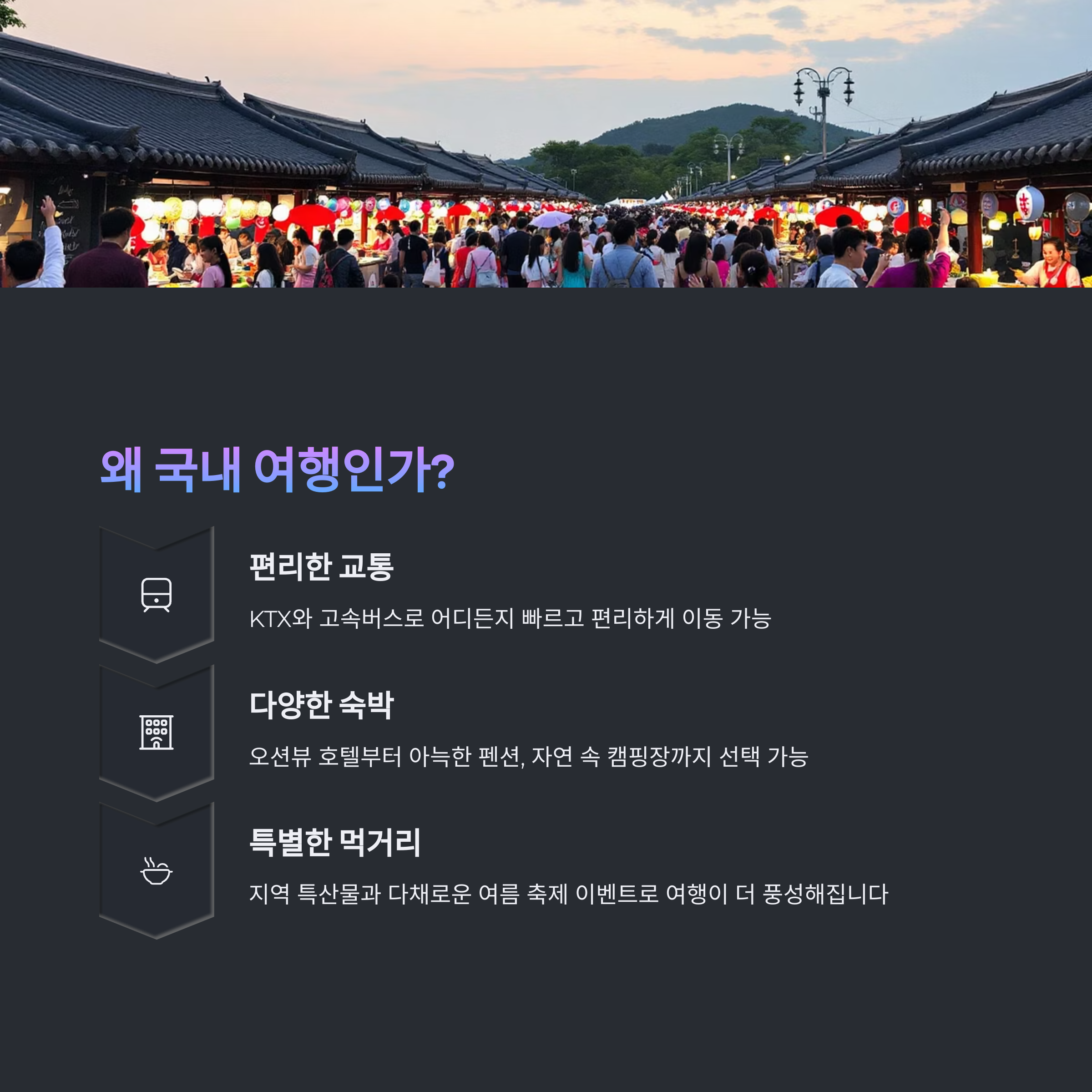 | 숙소, 교통, 축제까지 완비된 인프라 | 청량한 바다와 풍경으로 무더위 탈출 | 조용한 쉼을 원한다면 내륙 산책지 추천 |