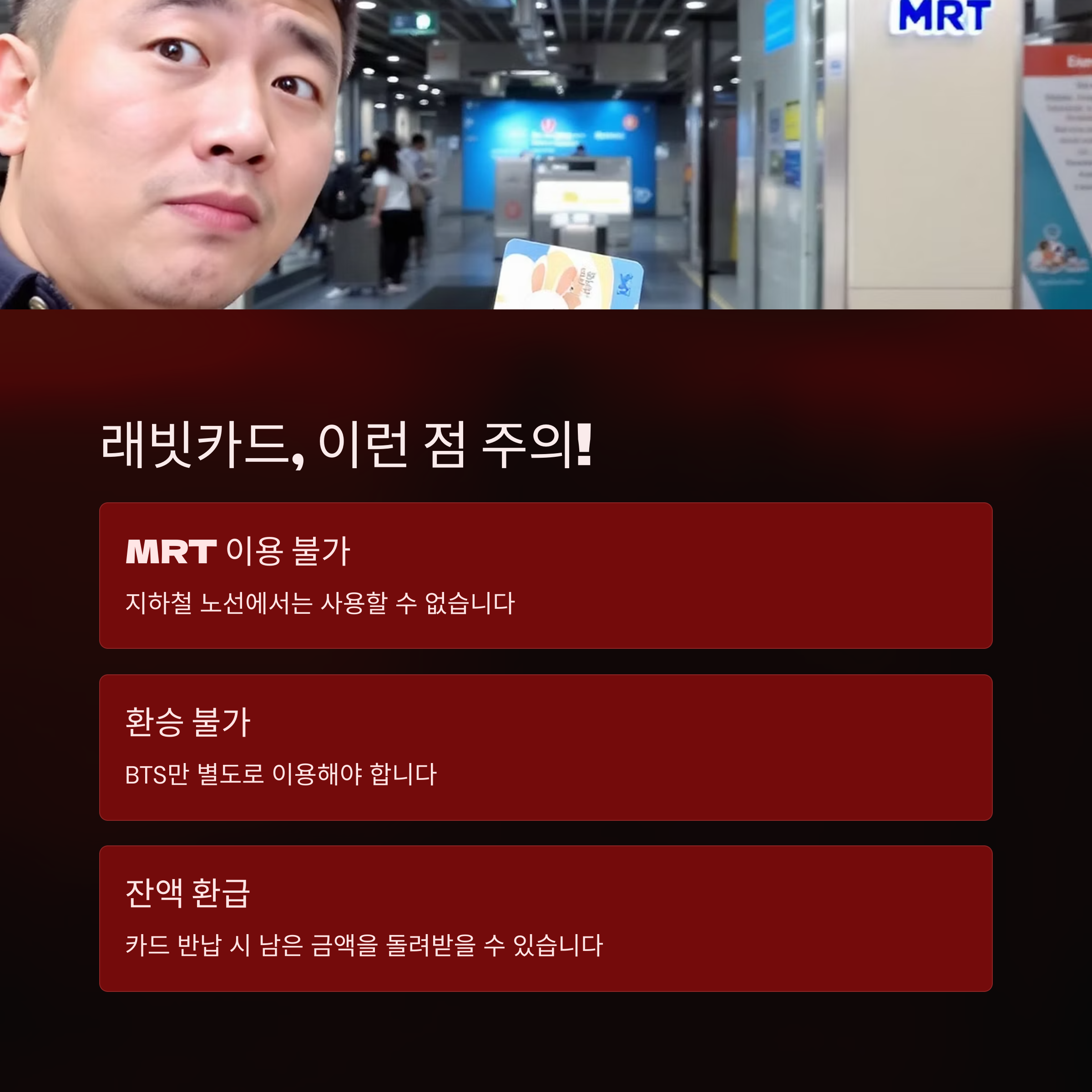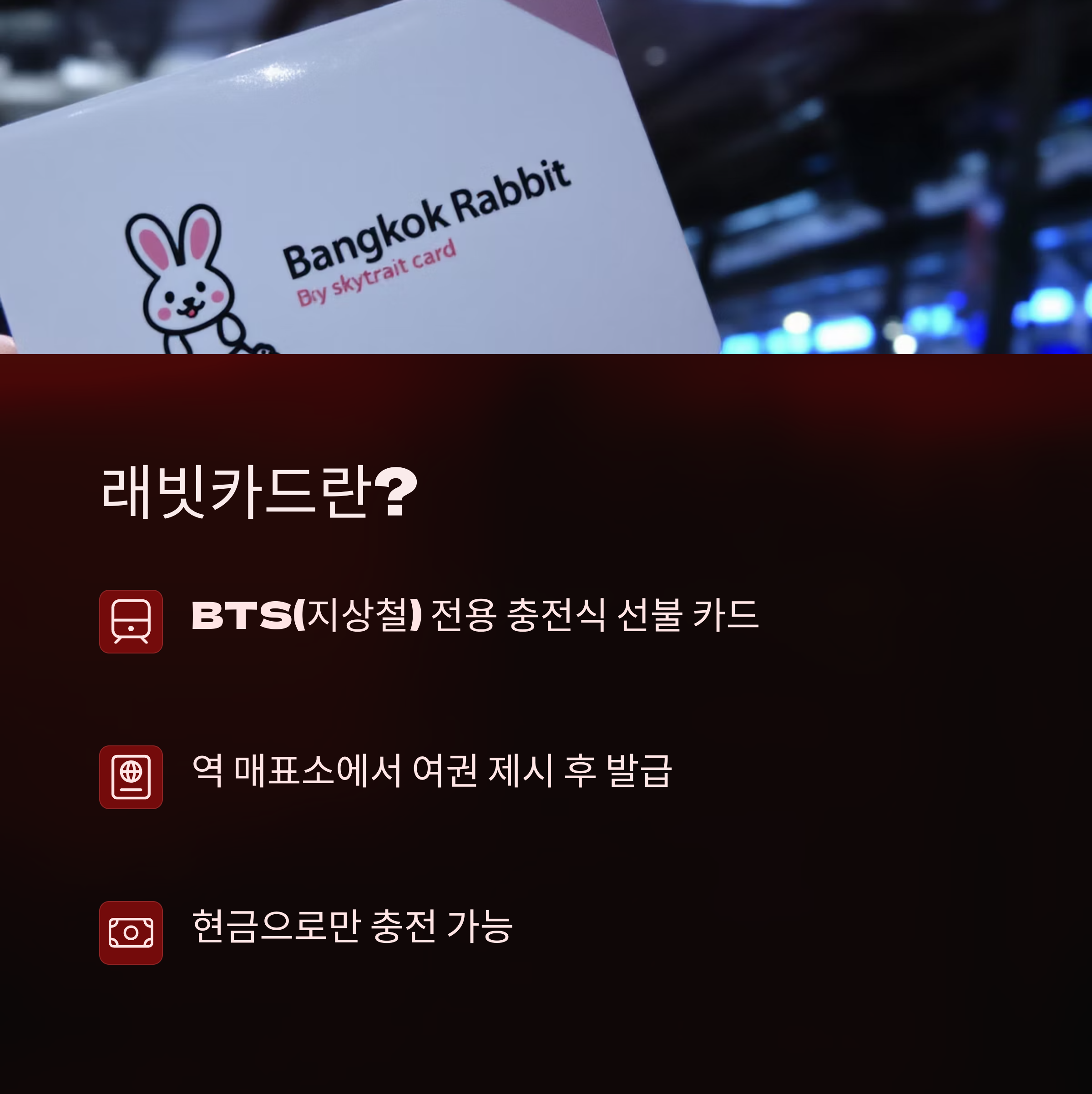 | BTS 역에서 여권 제시 후 구입 가능하며, 현금 충전 필요 | MRT, ARL 등 컨택리스 단말기 있는 곳에서 즉시 사용 가능 | BTS만 이용할 경우 래빗카드, 다양한 노선은 트래블월렛 |