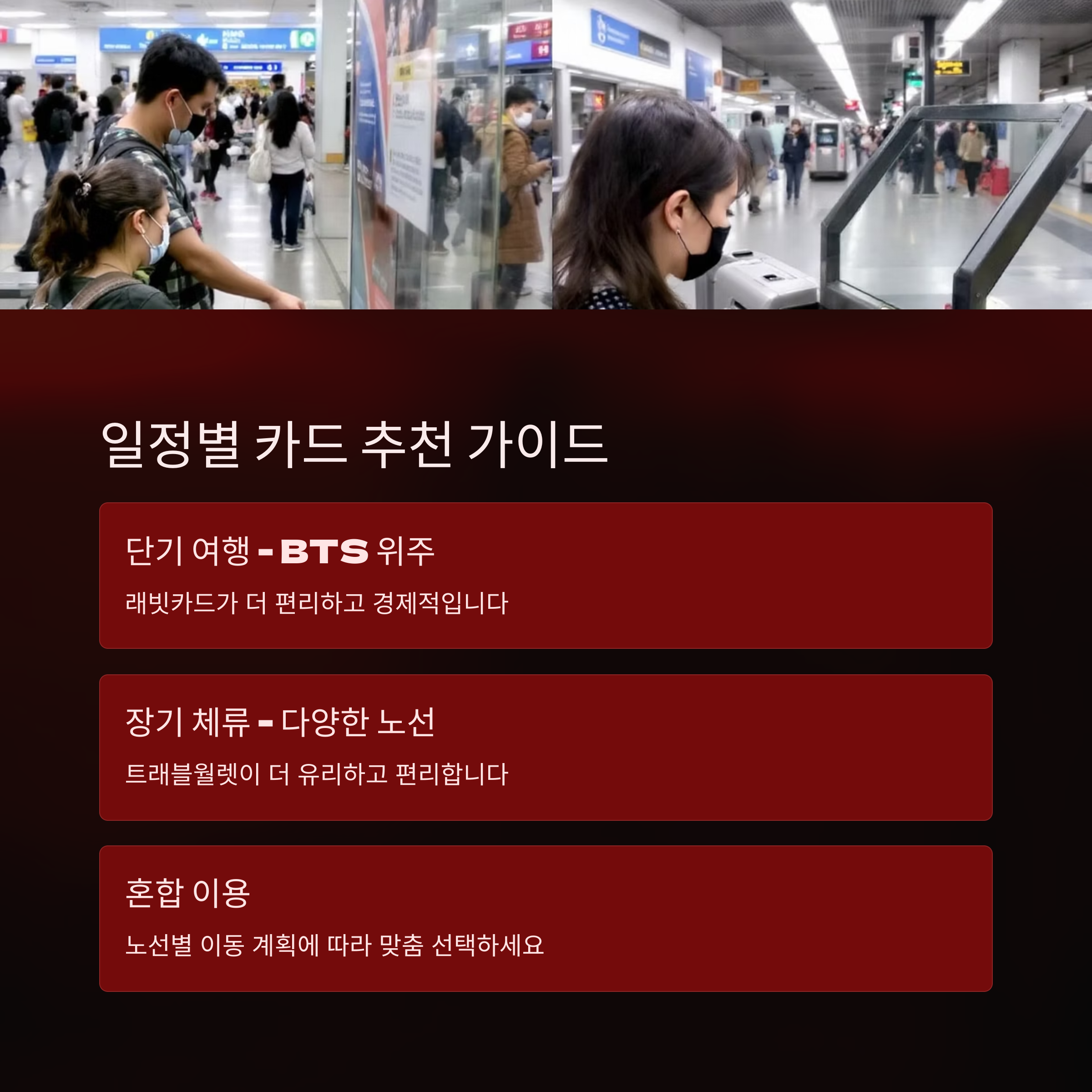결과적으로 일정이 짧고 BTS 중심의 관광 루트를 계획한다면 래빗카드가 충분하며, MRT, 공항철도 등 다양한 노선을 이용할 예정이라면 트래블월렛을 준비하는 것이 효율적입니다. 두 카드는 서로 연동되지 않기 때문에 환승 할인이나 통합 요금제가 없어, 일정에 따라 카드 선택이 매우 중요합니다. 특히 단기 여행자에게는 하나의 카드만으로 모든 노선을 이용하기보다는, 노선별로 필요한 카드를 분리해 준비하는 것이 이동 시간 단축과 스트레스 감소에 큰 도움이 됩니다.