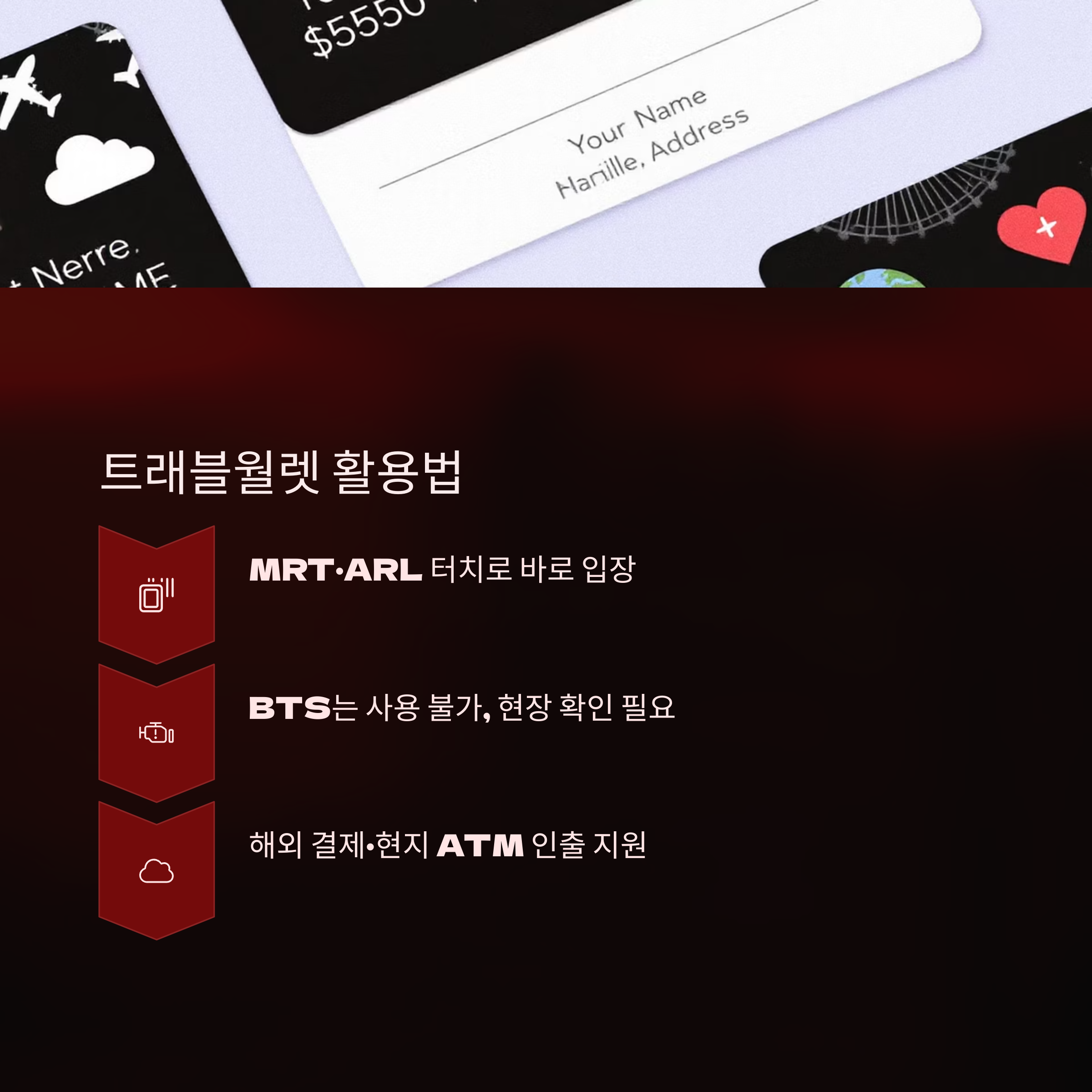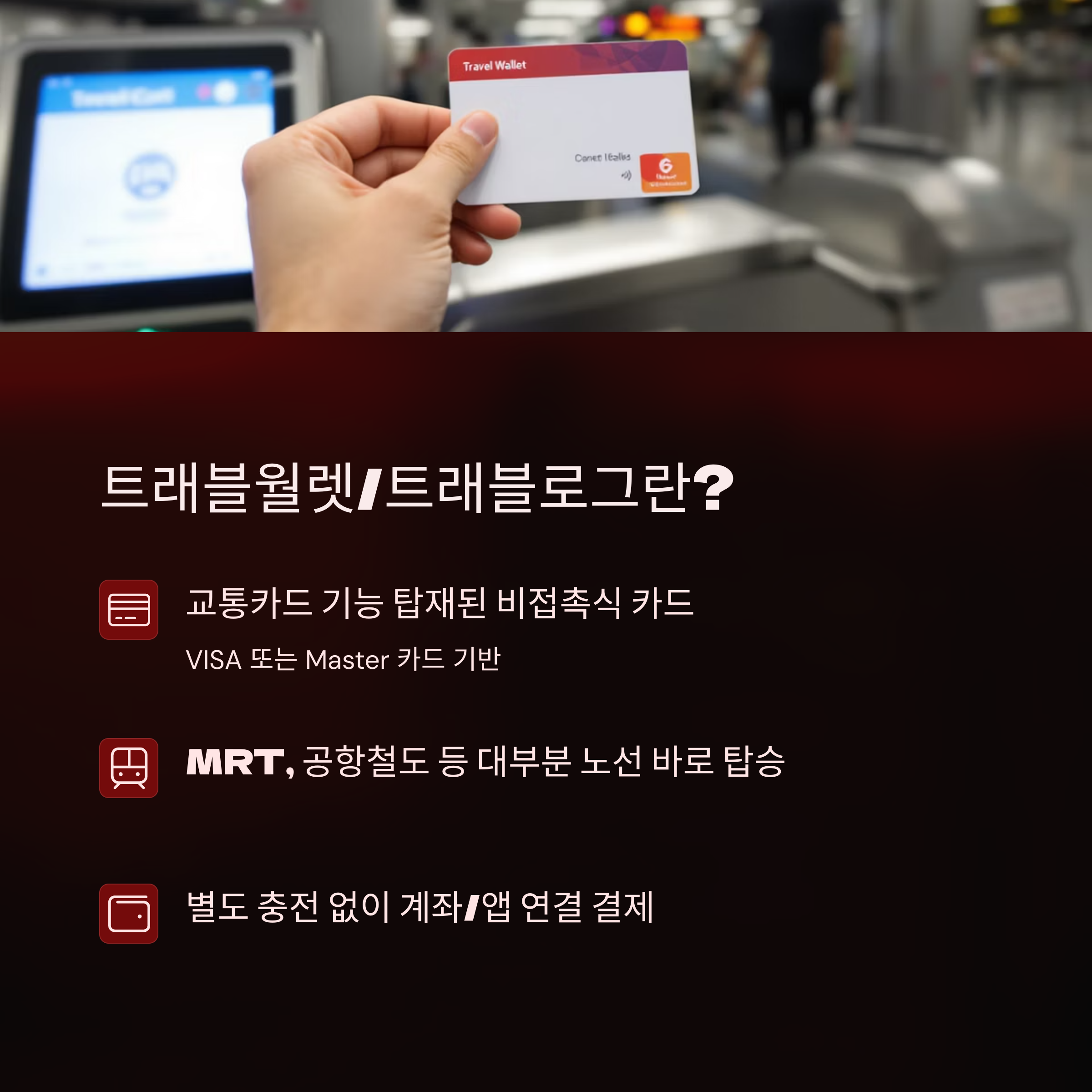 | 트래블월렛 | MRT 포함 다양한 교통수단에 컨택리스로 사용 가능해요. |
