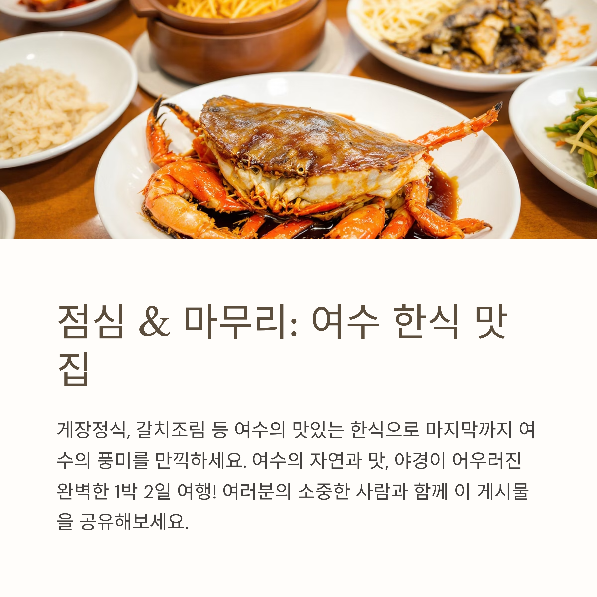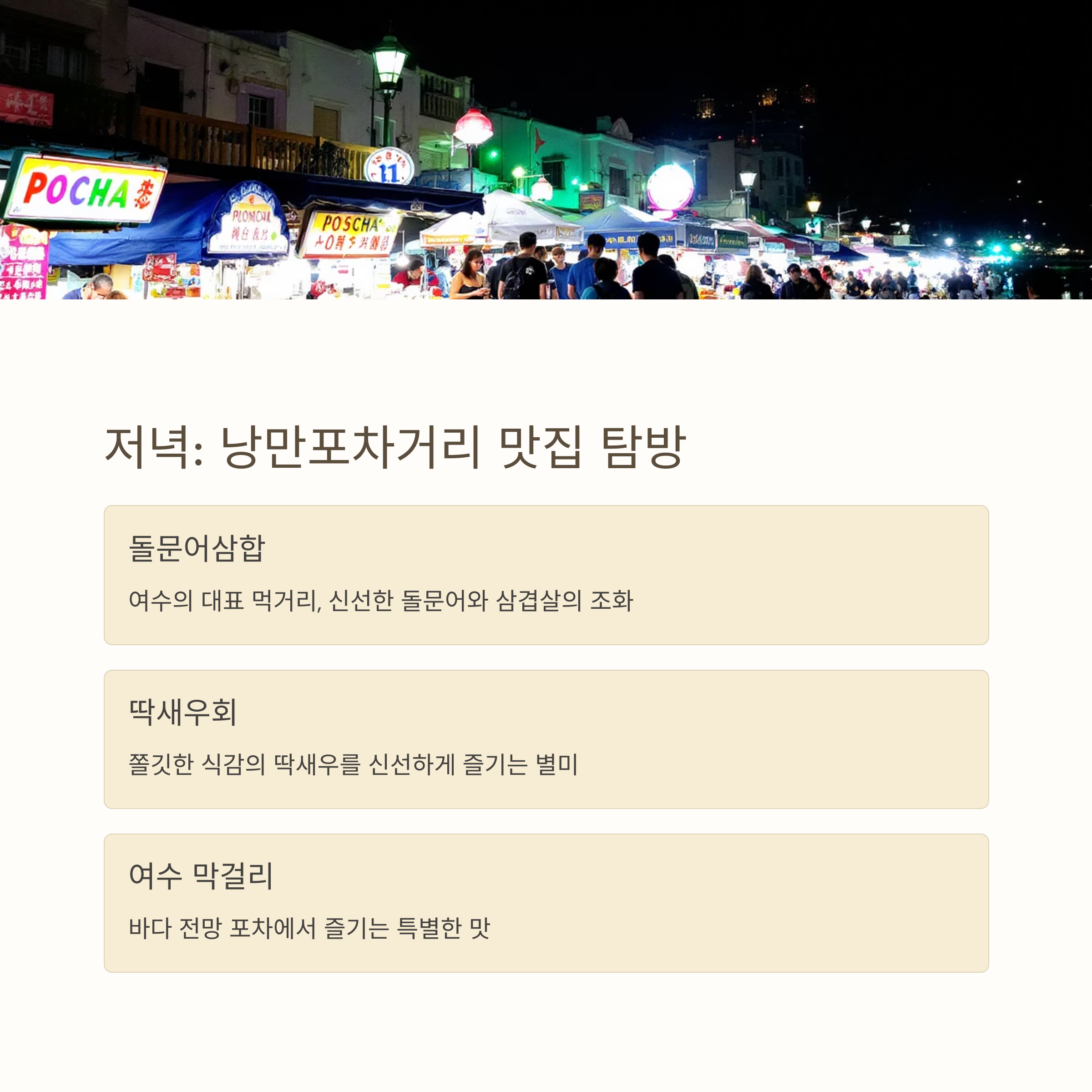 | 여수 밤바다와 도시 조명의 조화 | 신선한 해산물 중심의 해양 미식 여행 | 가족, 연인 모두 즐기기 좋은 관광 루트 |