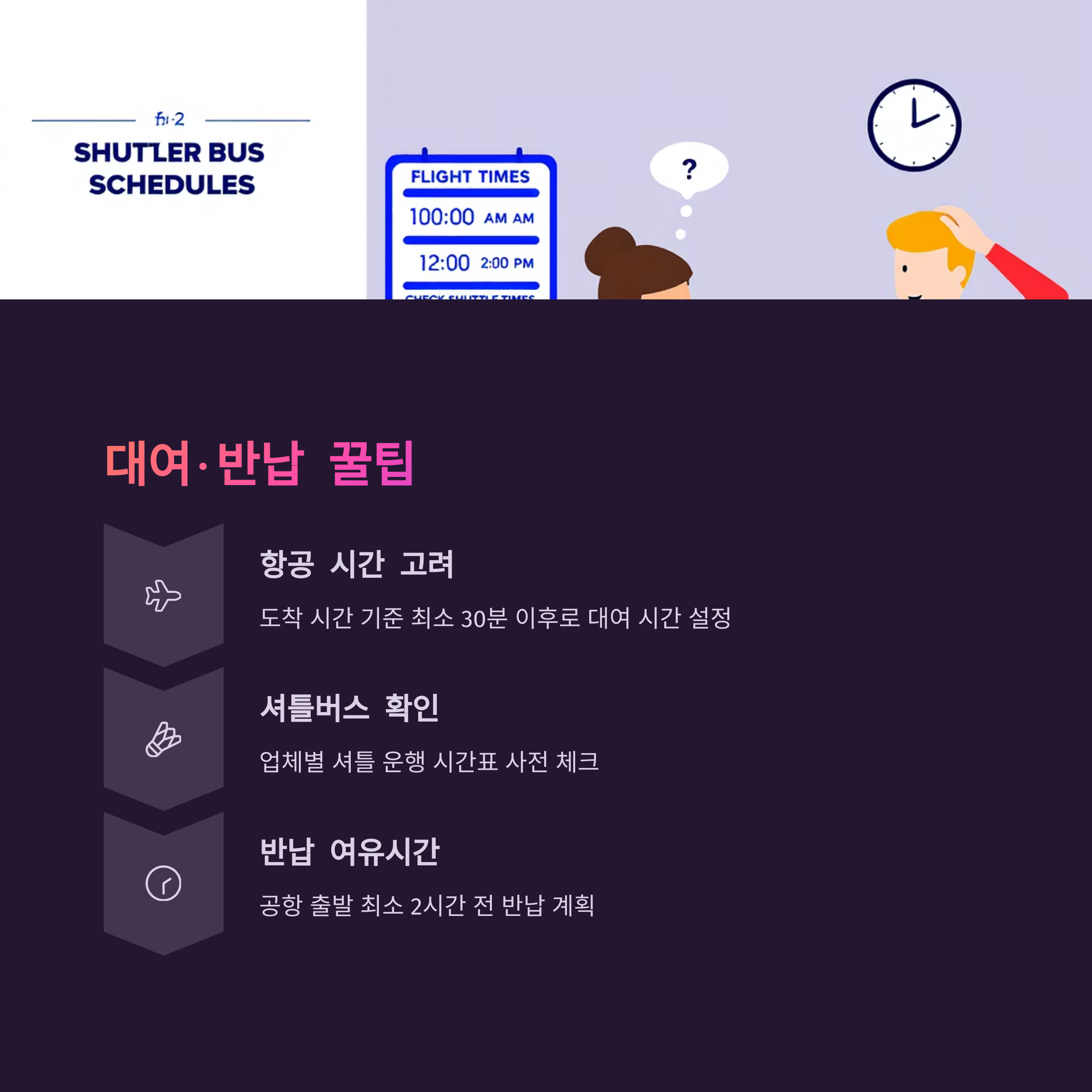 렌트카 이용 전에는 차량 상태 확인과 보험 체크는 필수입니다. 반납 시 연료 정책도 꼼꼼히 확인하고, 특히 공항까지 셔틀 대기 시간과 이동 시간 등을 넉넉히 계산하여 불필요한 지연을 방지해야 합니다. 또한, 제주 시내는 교통체증이 심하고 주차 공간이 부족한 경우가 많아 필요 시 대중교통도 함께 고려해보는 것이 현명한 선택입니다.