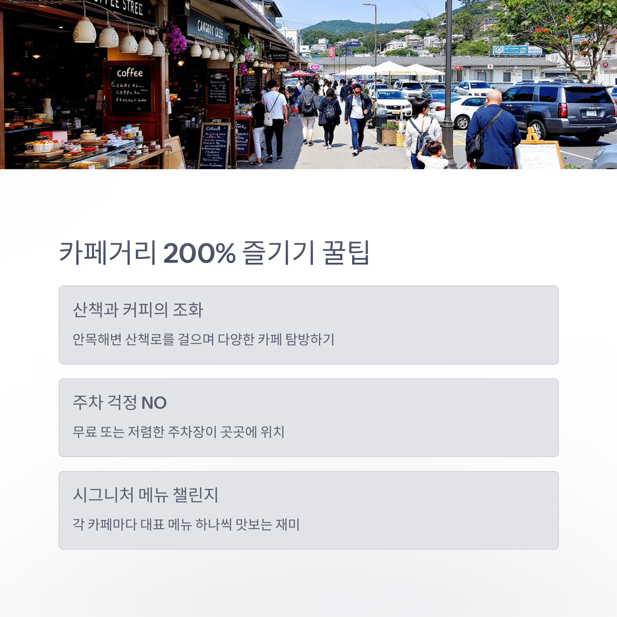 | 트렌디한 인테리어와 감성적인 분위기 | 카페거리에서 즐기는 커피와 디저트 | 창밖으로 펼쳐지는 넓은 바다 전망 |