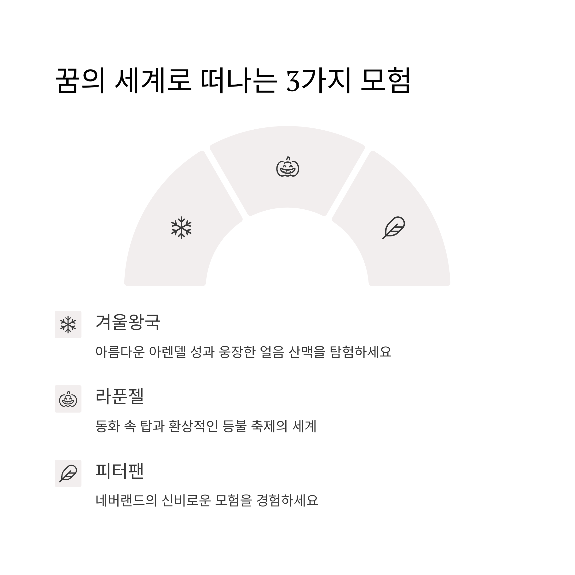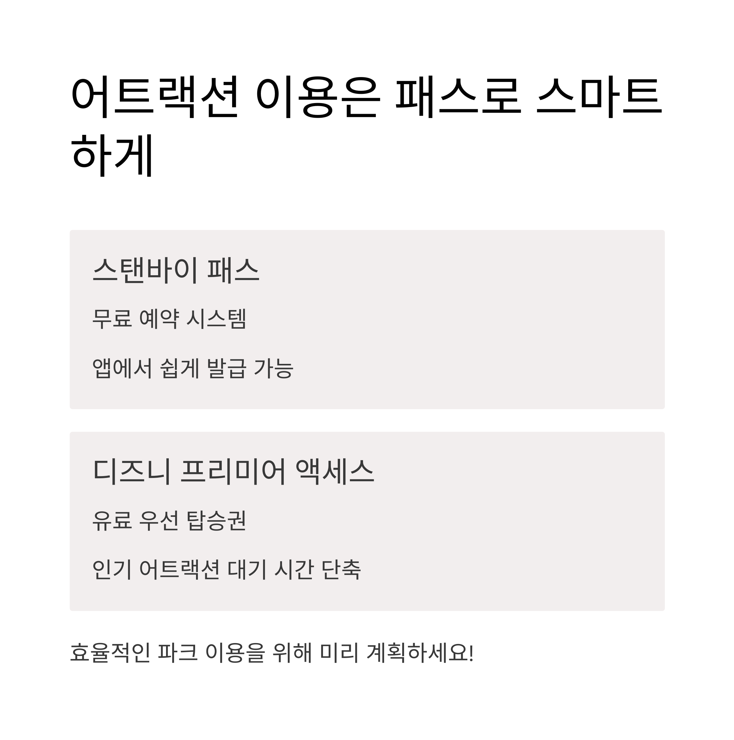 | 겨울왕국, 라푼젤, 피터팬 존 | 앱 지도 통해 실시간 입장 가능 여부 확인 | 스탠바이 패스·프리미어 액세스 미리 준비 |