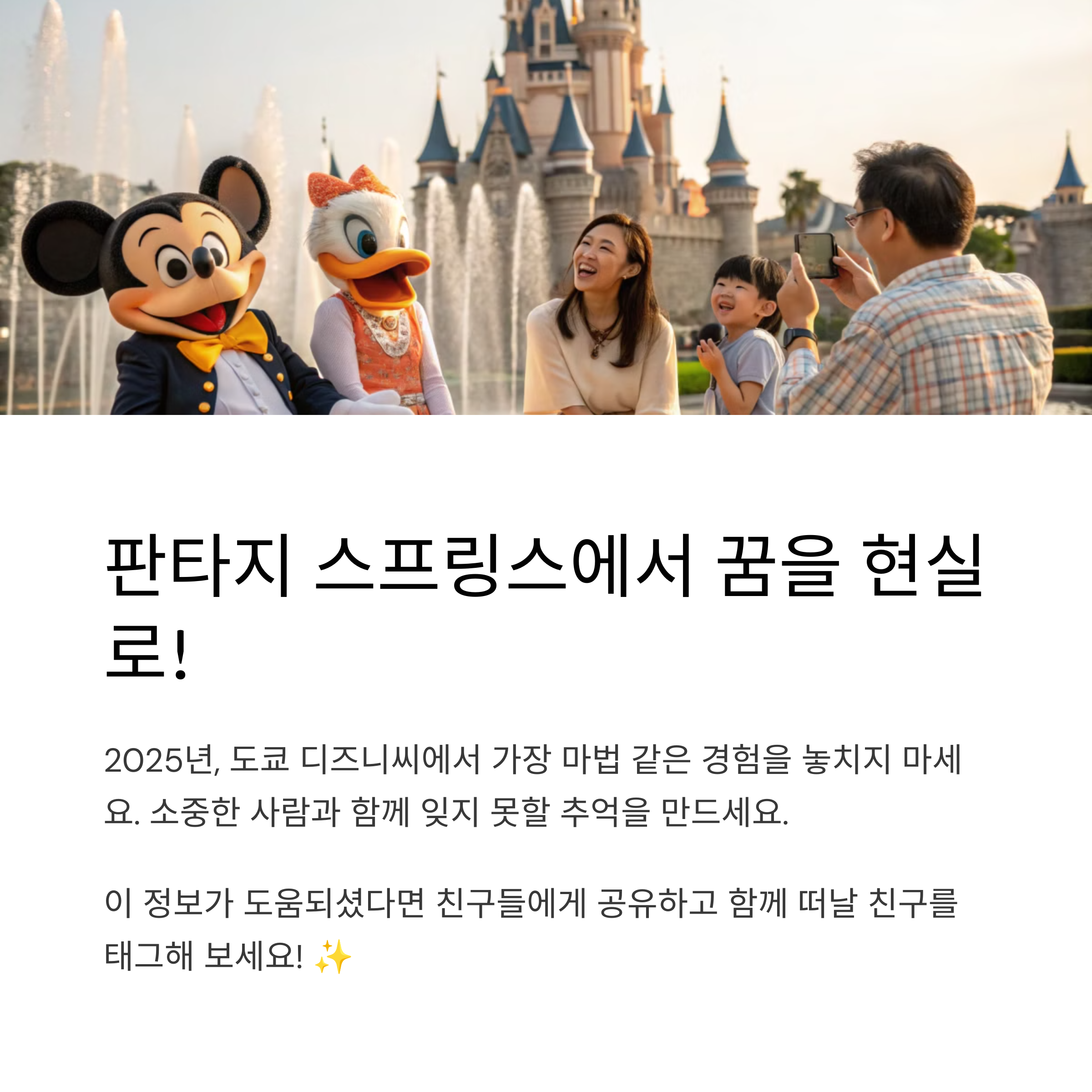 도쿄 디즈니씨의 판타지스프링스는 디즈니 팬이라면 반드시 방문해야 할 꿈의 공간입니다. 입장 방식이 유연해졌지만, 인기 지역이므로 앱 활용, 입장 시점 체크, 패스 예약은 여전히 필수 요소입니다. 테마 구역별로 구성된 어트랙션과 세계관을 충분히 즐기기 위해서는 철저한 사전 준비가 필요합니다. 이번 여행이 여러분에게 마법 같은 하루로 기억되기를 바랍니다.