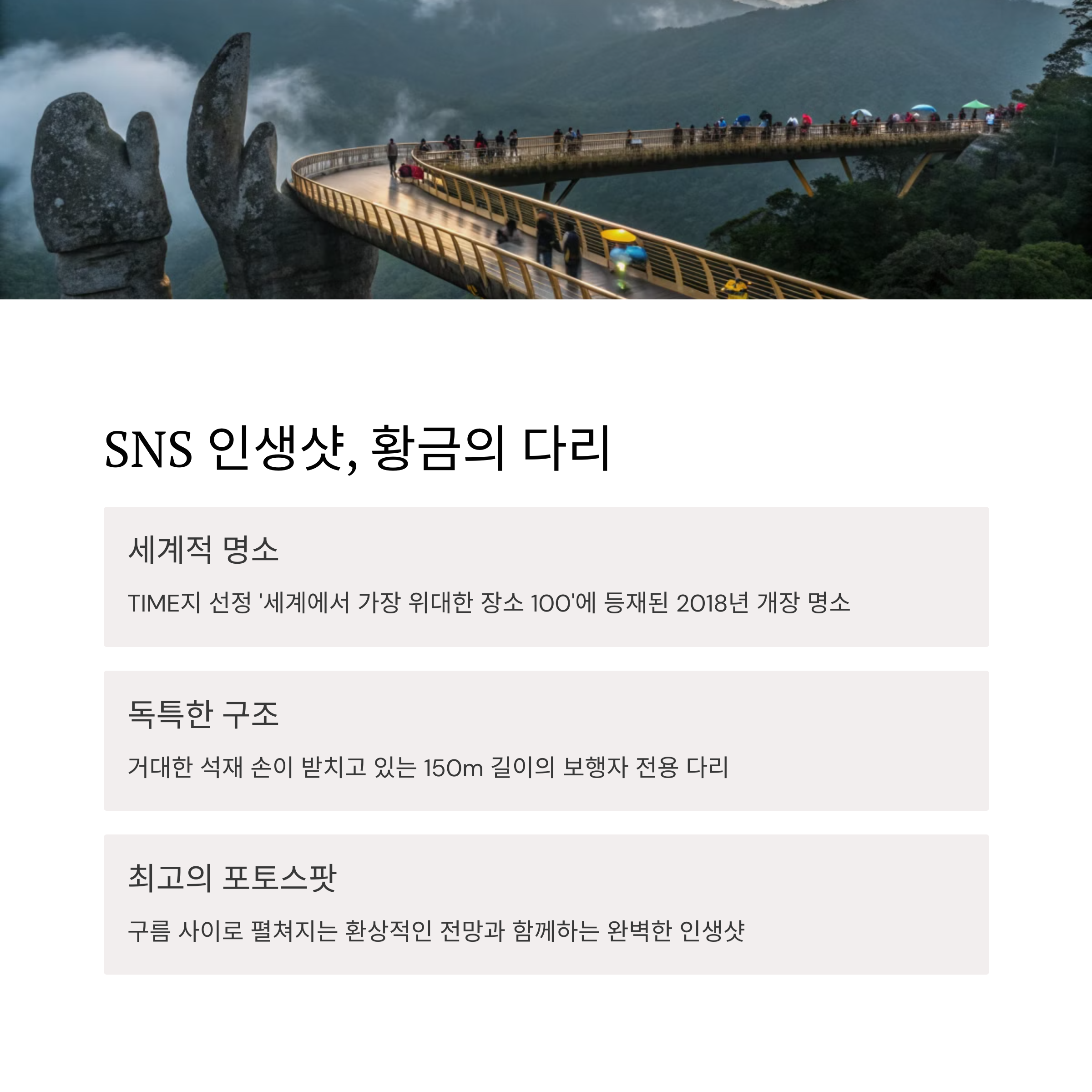 다낭에서 출발하는 바나힐 투어는 아침 일찍부터 시작됩니다. 세계 최장 길이로 유명한 케이블카를 타고 산속을 올라가는 순간부터 여행의 설렘이 가득 차오릅니다. 정상에 도착하면 가장 먼저 마주하게 되는 명소는 거대한 손 조형물이 떠받치고 있는 황금다리입니다. 이곳은 인생샷을 남기기 위한 필수 포토존으로, 날씨가 맑은 날에는 멀리 펼쳐지는 산자락과 조화를 이루며 감탄을 자아냅니다. 이어지는 프랑스 마을, 꽃 정원, 판타지 파크 등은 가족 단위 여행자나 커플에게 인기 있는 코스로, 이국적인 분위기 속에서 여유롭게 산책을 즐기기 좋습니다.