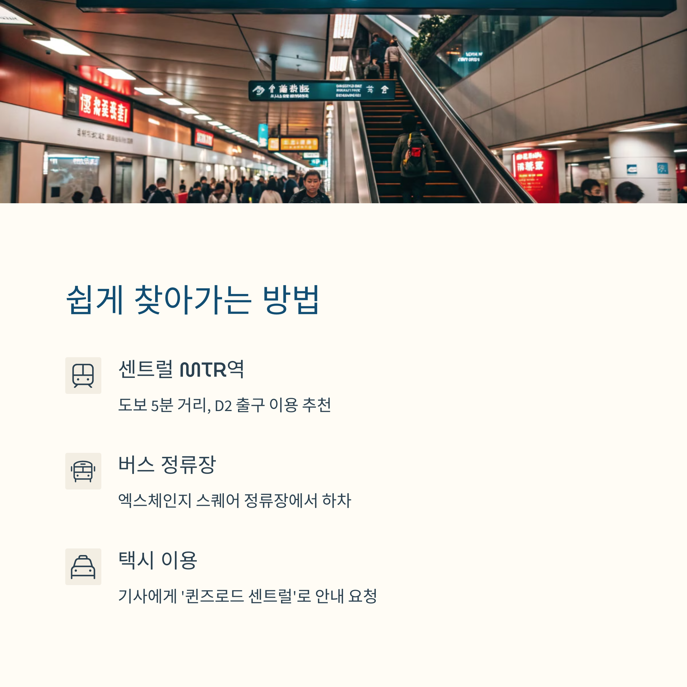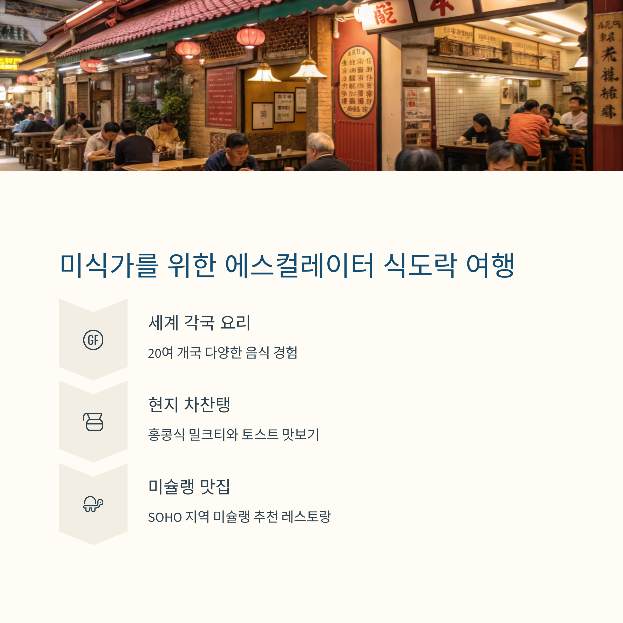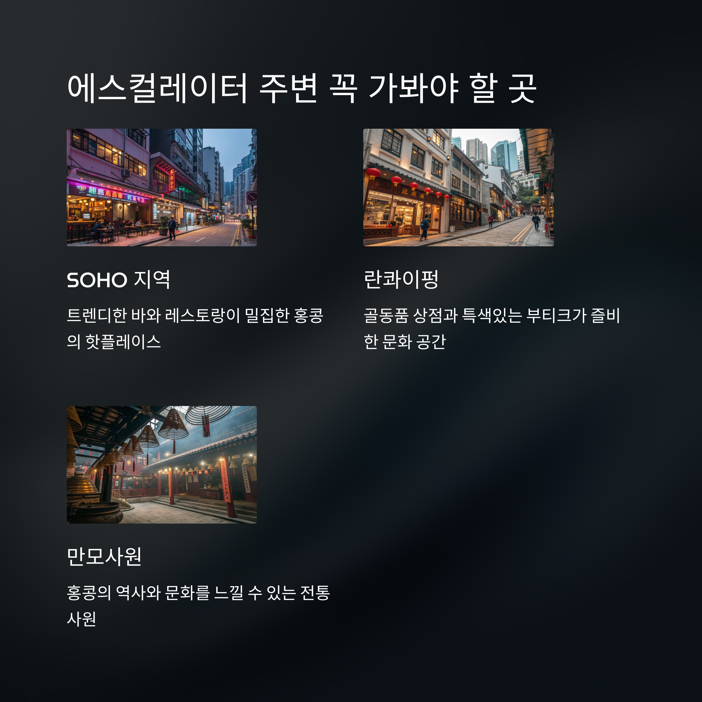 교통 접근성 역시 훌륭합니다. MTR 센트럴역에서 도보 약 5분 거리로, 처음 방문하는 사람도 길 찾기 어렵지 않게 도착할 수 있습니다. 주변에는 다양한 테마의 카페, 트렌디한 레스토랑, 감각적인 갤러리가 즐비해 홍콩의 도시 감성을 오감으로 느낄 수 있습니다. 단순히 에스컬레이터만 타는 것이 아닌, 현지인의 삶과 분위기를 함께 경험하는 시간이 될 것입니다.