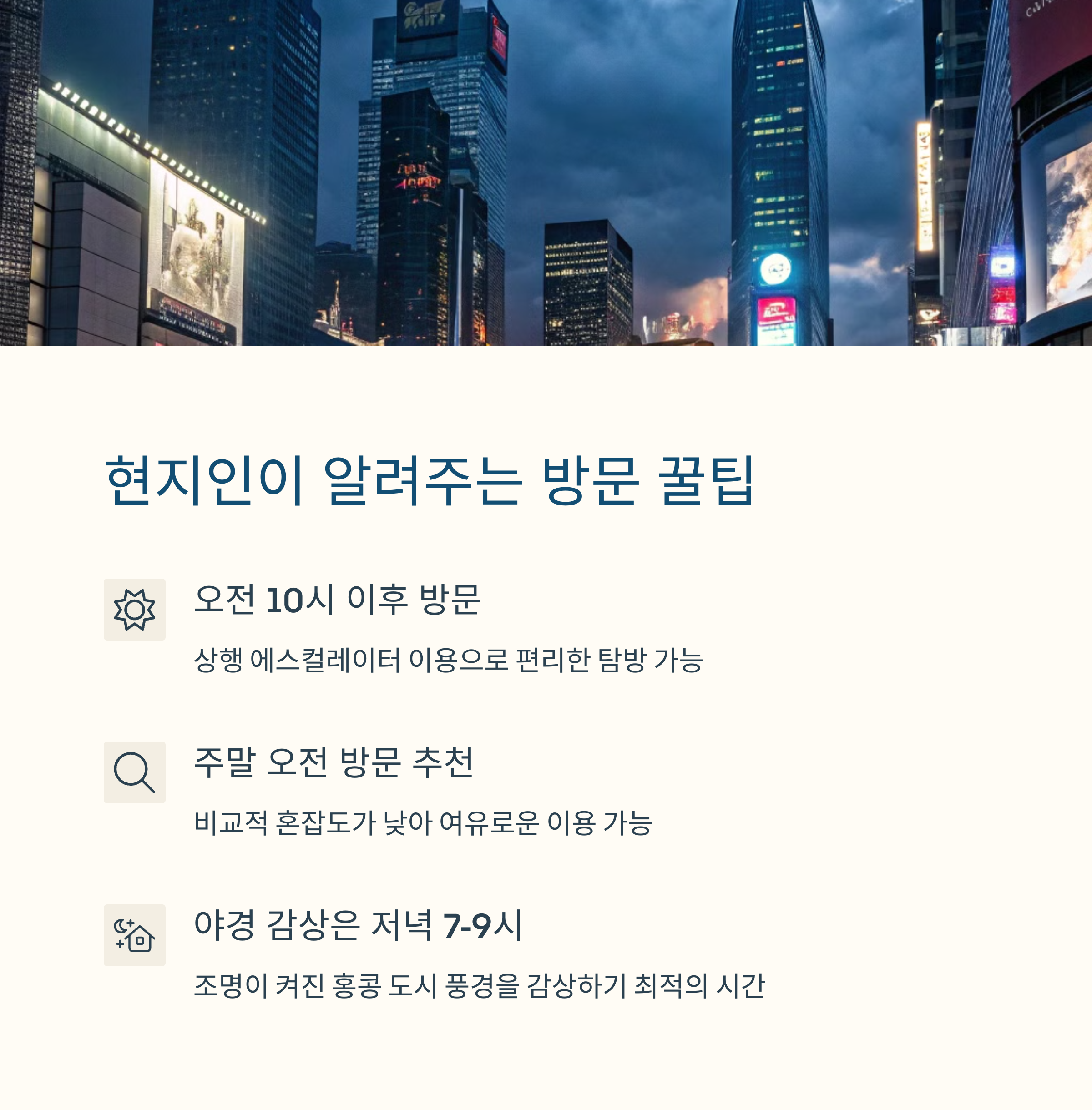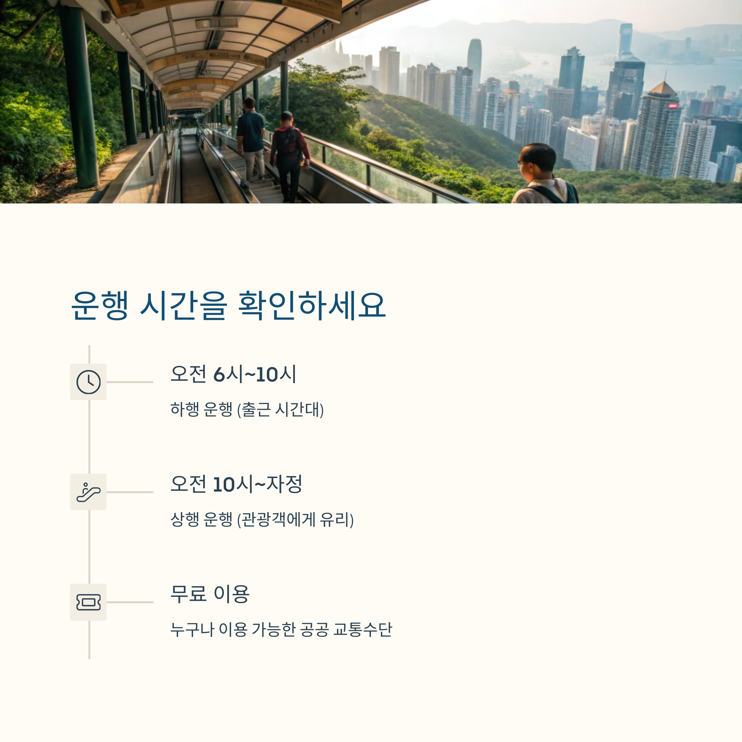 오전 10시 이후에 방문하는 것이 현명한 팁입니다. 이때부터 상행 운행이 시작되어 걸어서 올라갈 필요 없이 에스컬레이터를 타고 편안하게 올라갈 수 있습니다. 중간에 내려서 SOHO 거리나 란콰이펑, 만모사원 등 인기 관광지를 구경할 수 있어 효율적인 동선으로 여행을 즐기기에 안성맞춤입니다. 특히 구간별 하차가 가능하므로, 다양한 명소를 계획적으로 방문하고 싶은 여행자에게 큰 만족감을 줍니다.