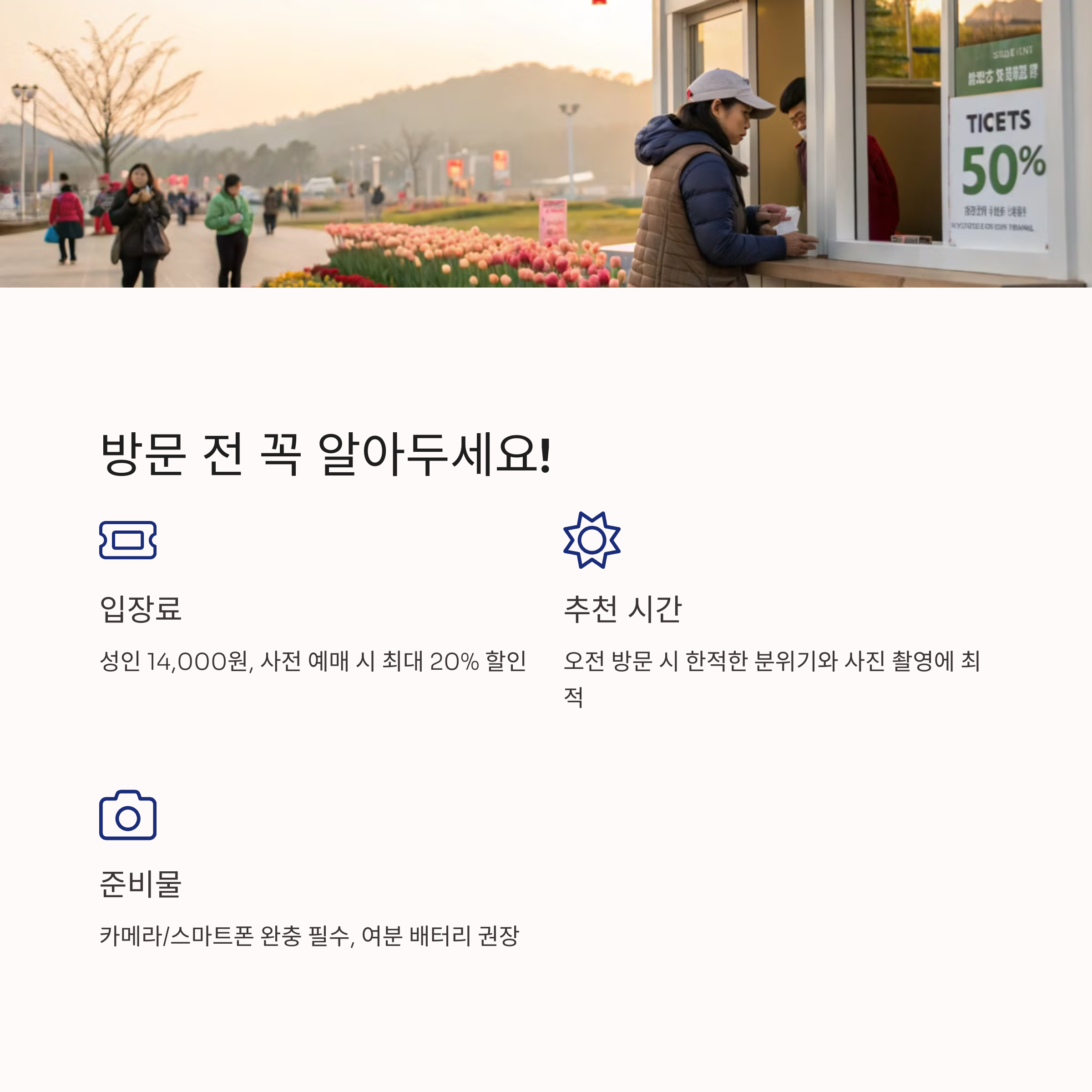 | 4월 8일부터 5월 6일까지 운영됩니다. | 성인 기준 14,000원입니다. | 오전 시간대가 조용하고 빛이 좋습니다. |