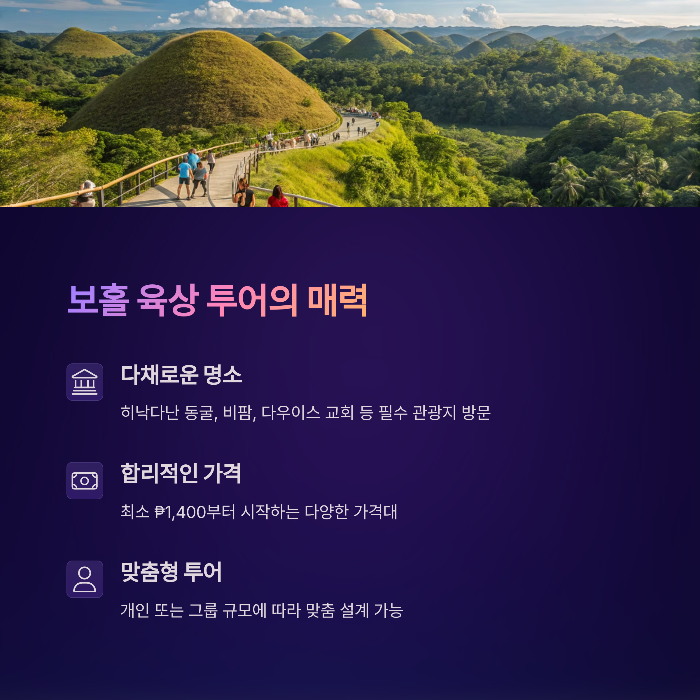 보홀 육상 투어는 섬의 다양한 명소를 하루에 효율적으로 둘러볼 수 있어 첫 방문자에게 특히 유용한 코스입니다. 히낙다난 동굴은 신비로운 동굴 속 석회암 지형과 맑은 물로 유명하며, 비 농장에서는 유기농 허브와 식물들을 체험할 수 있습니다. 다우이스 교회는 아름다운 고딕 양식으로 사진 명소로도 잘 알려져 있어요.