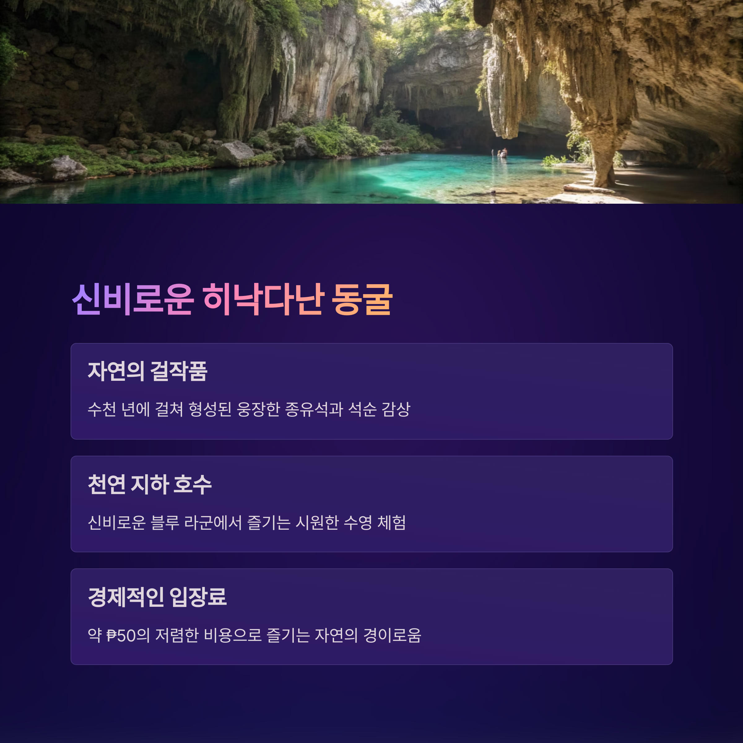| 석회암과 맑은 물이 인상적인 동굴 | 강 위에서 감상하는 야간 체험 | ₱1,400~₱4,500 또는 $80 수준 |