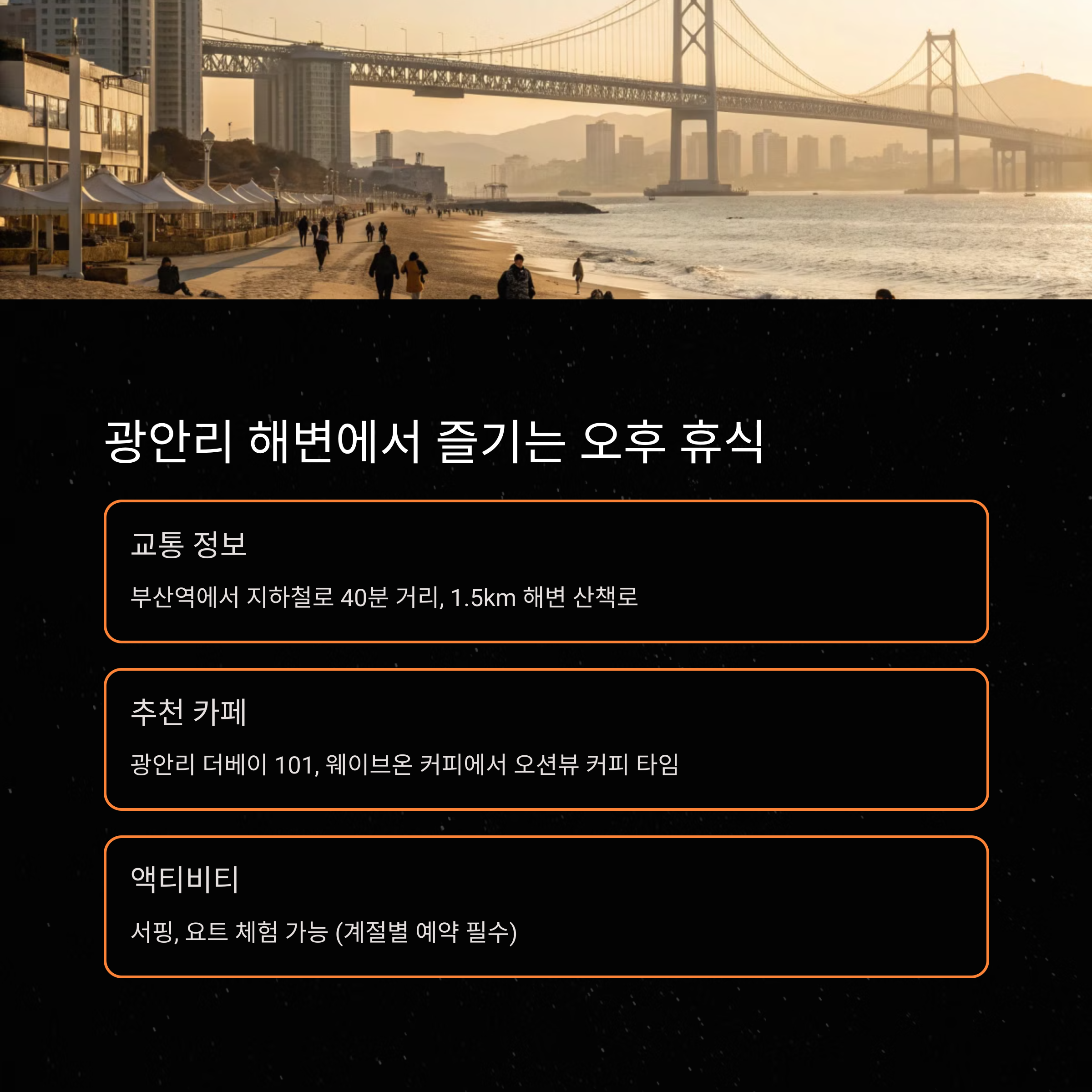 하루를 마무리할 저녁 식사는 광안리 해변 근처의 분위기 좋은 식당에서 즐겨보세요. 바다를 보며 식사할 수 있는 루프탑 레스토랑이나 야외 테라스를 갖춘 카페는 여행의 마무리에 감성을 더해줍니다. 특히 광안대교의 야경은 부산을 대표하는 뷰로, 해 질 무렵부터 조명이 하나둘 켜지는 장면은 꼭 놓치지 말아야 할 포인트예요. 드라이브와 맛집, 자연과 도심이 어우러진 하루 코스로 부산을 오롯이 즐길 수 있습니다.