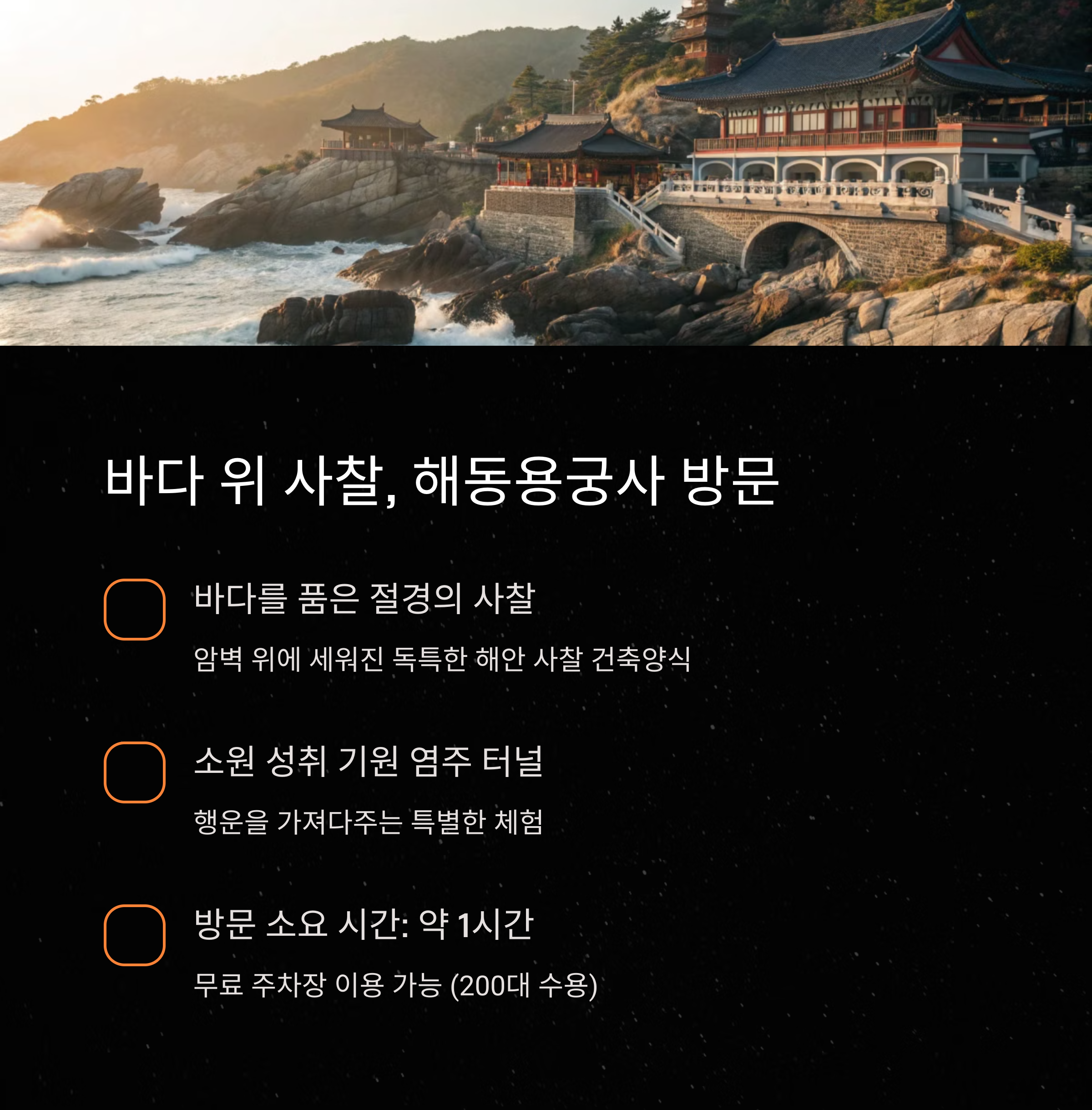 | 기장 해안도로, 해동용궁사, 오랑대공원 | 본전돼지국밥, 영동밀면, 광안리 레스토랑 | 아침 출발 – 점심 – 해변 – 야경 코스 |