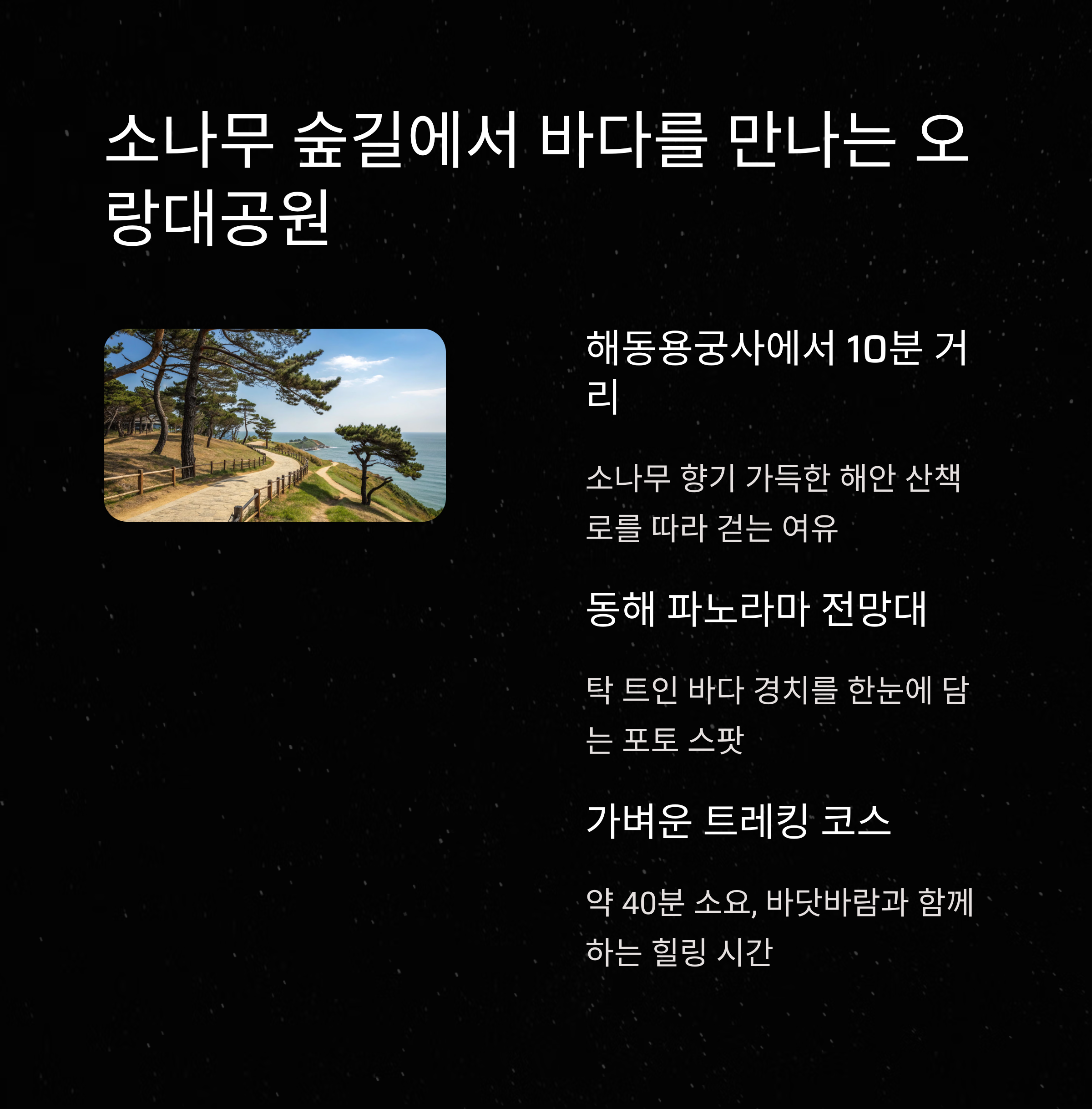 부산역에서 출발하는 여행은 교통의 편리함 덕분에 하루 코스로도 충분히 알차게 구성할 수 있습니다. 특히 기장 해안도로를 따라 드라이브를 즐기며 푸른 바다를 감상하면, 도심의 피로가 금세 사라지는 기분을 느낄 수 있죠. 중간에 위치한 해동용궁사나 오랑대공원은 잠시 산책하며 사진 찍기 좋은 포인트로도 유명해요. 빠르게 이동하기보다 풍경을 천천히 즐기며 여행의 여유를 누리는 것이 포인트입니다.