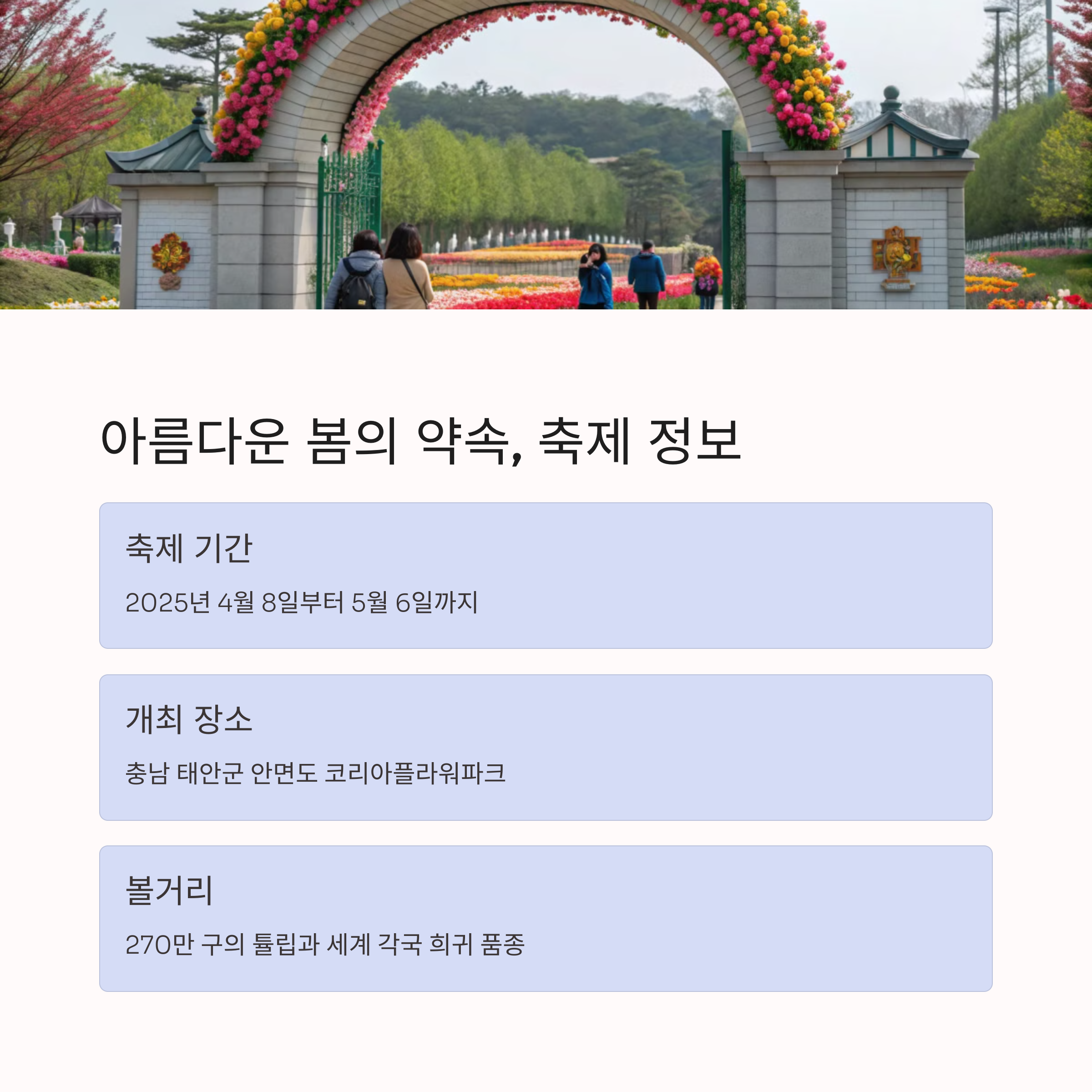 봄바람이 살랑이는 계절, 충남 태안 안면도에서는 매년 아름다운 튤립 축제가 열립니다. 특히 2025년 축제는 더욱 풍성하고 다채롭게 꾸며져 관람객들의 기대를 한 몸에 받고 있습니다. 형형색색의 튤립은 물론, 세계 각국의 희귀 품종과 이국적인 테마 정원이 어우러져 마치 한 편의 동화 속에 들어온 듯한 착각을 불러일으킵니다. 가족과 함께하는 소풍, 연인과의 데이트, 또는 감성 가득한 사진 여행을 계획 중이라면 이번 태안 튤립축제는 절대 놓치지 말아야 할 봄 여행지입니다. 본 포스팅에서는 축제에 대한 전반적인 정보는 물론, 관람 팁과 함께 SNS에서 핫한 포토존까지 안내해드릴 예정이니 끝까지 함께해 주세요.